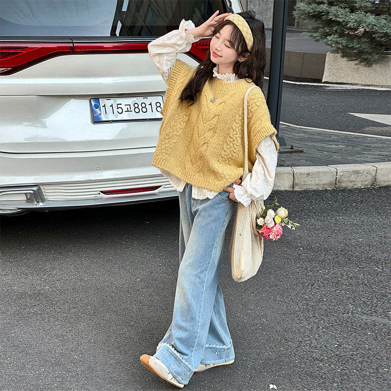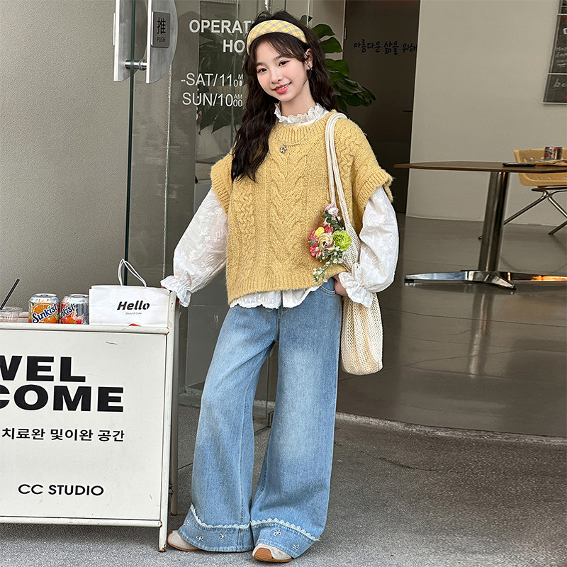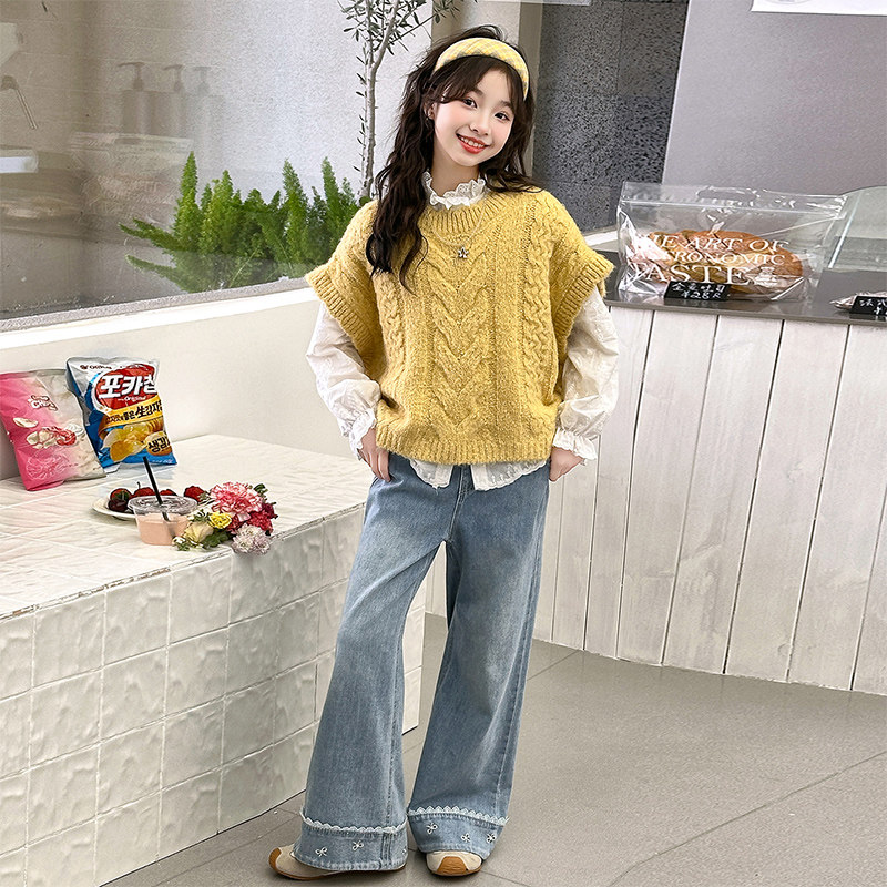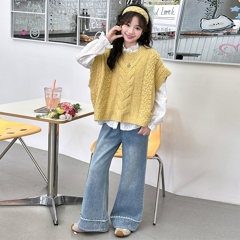 女童超好看马甲衬衫套装春装2026新款女孩大童韩系叠穿衬衫牛仔裤