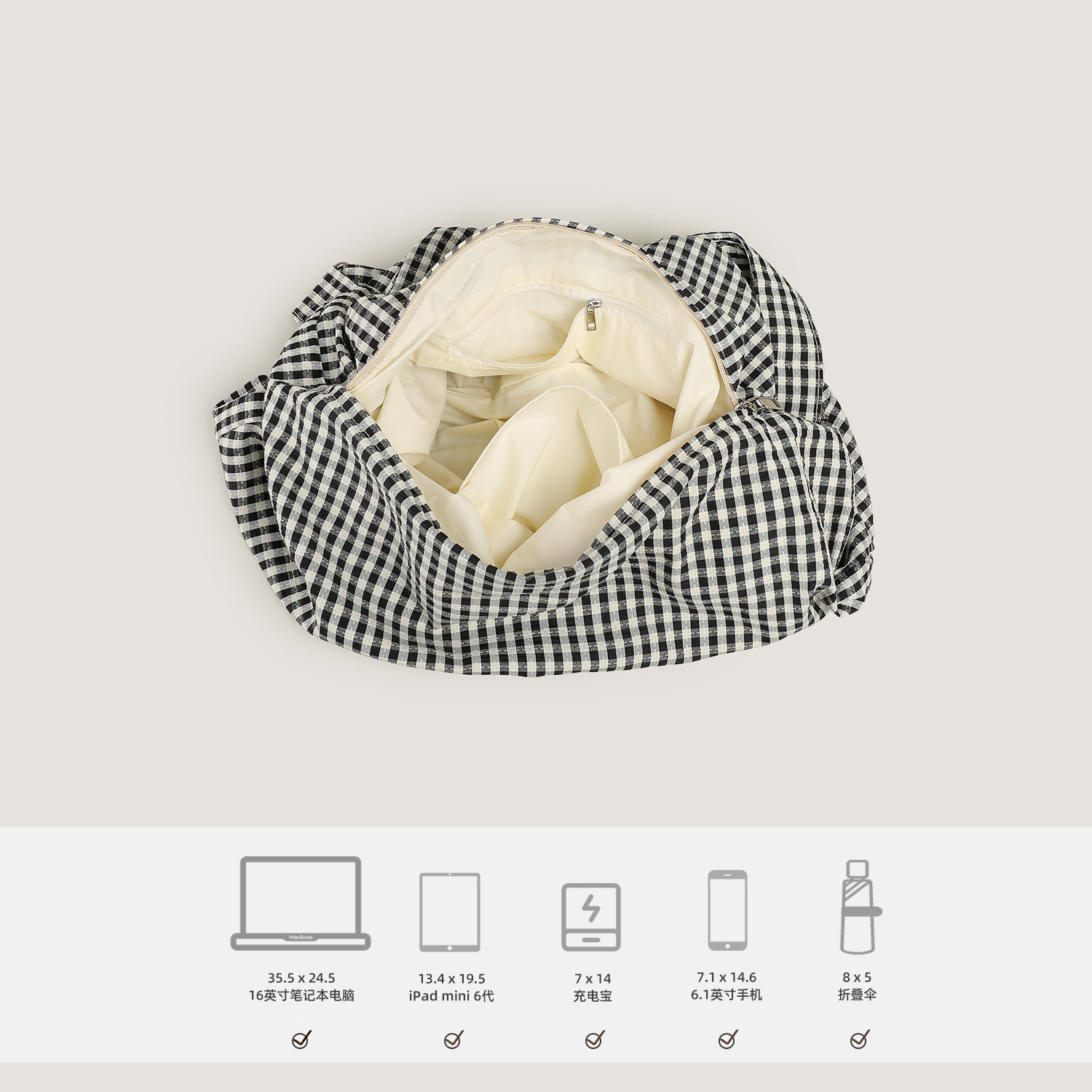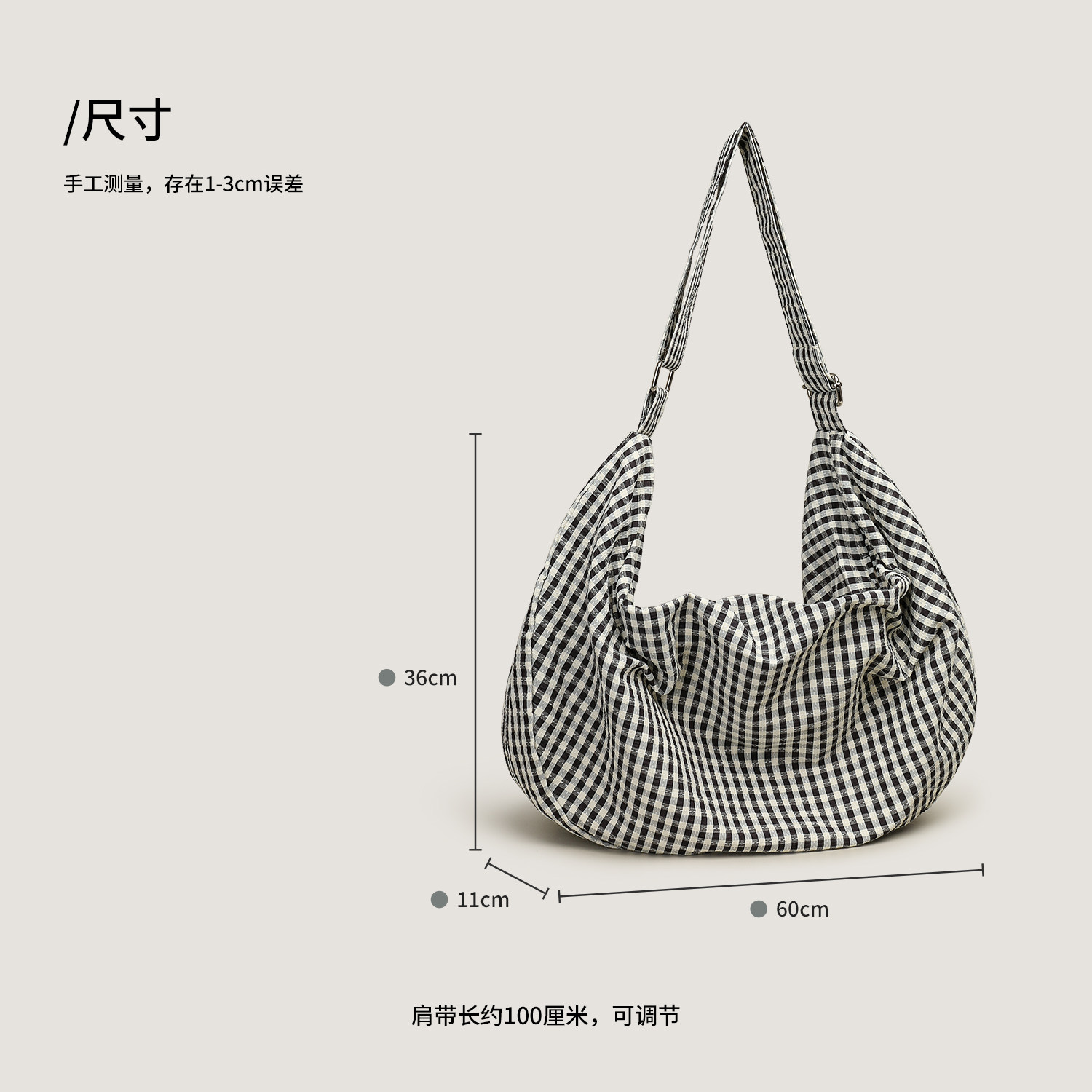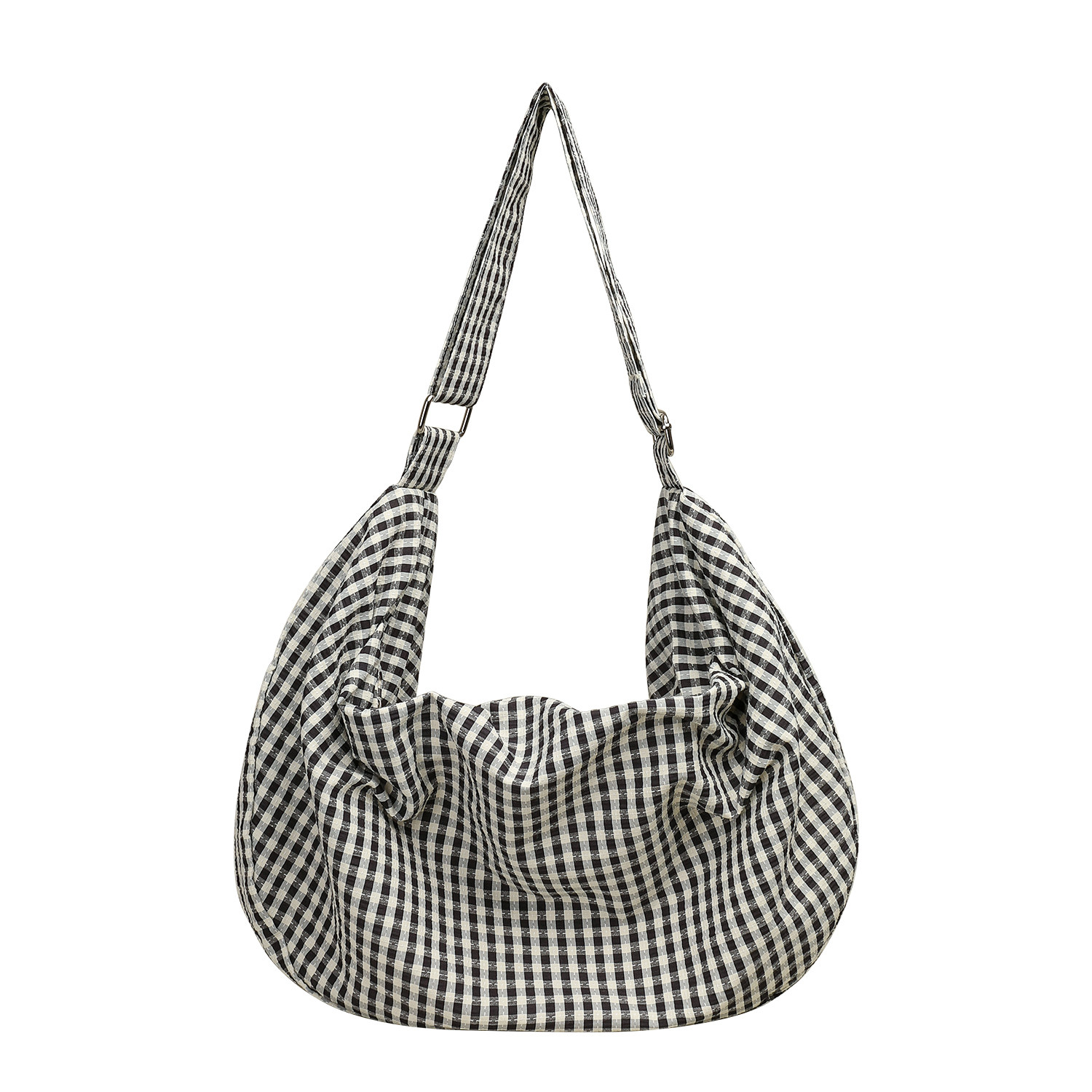 MISSX格子拉链帆布包女饺子包大容量宽肩带单肩斜挎包轻便百搭