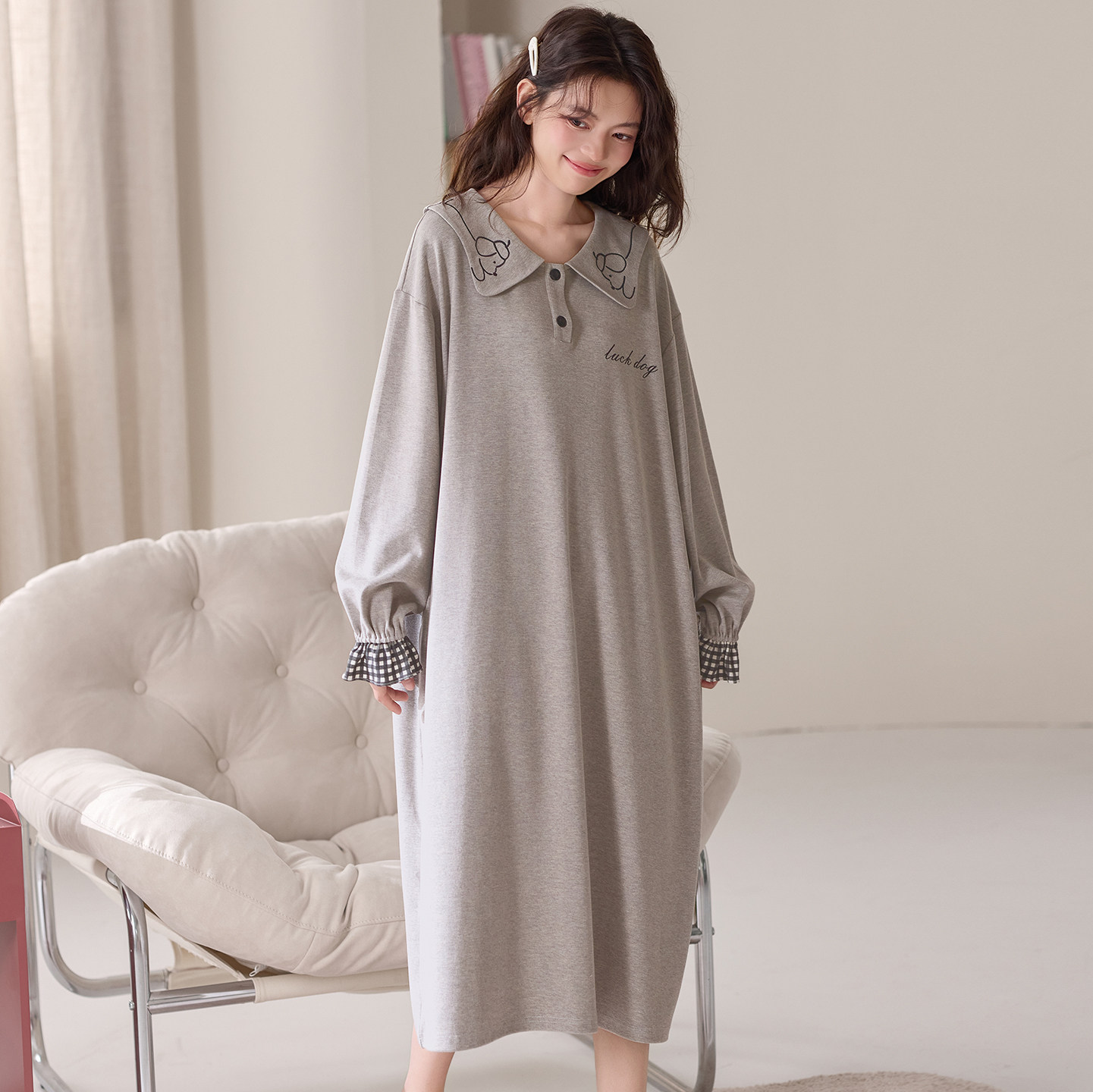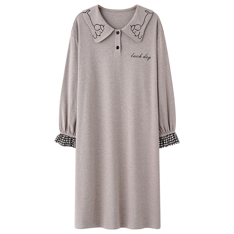 春秋季长袖翻领睡裙女款100%纯棉秋冬款学生卡通小个子连衣裙睡衣