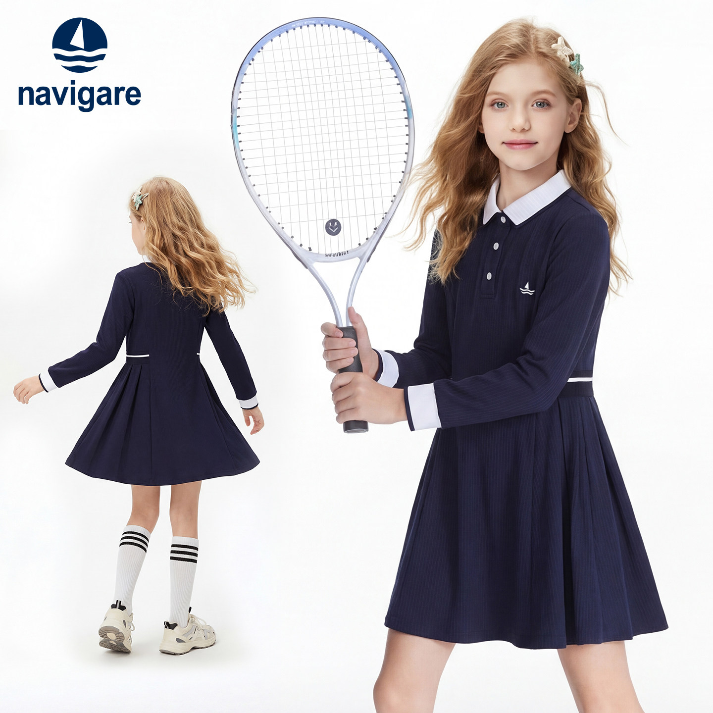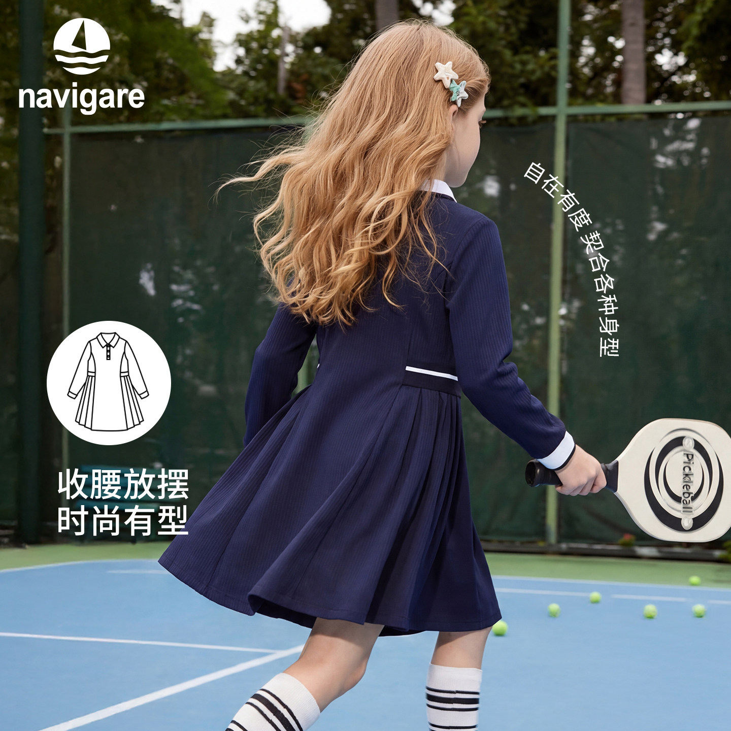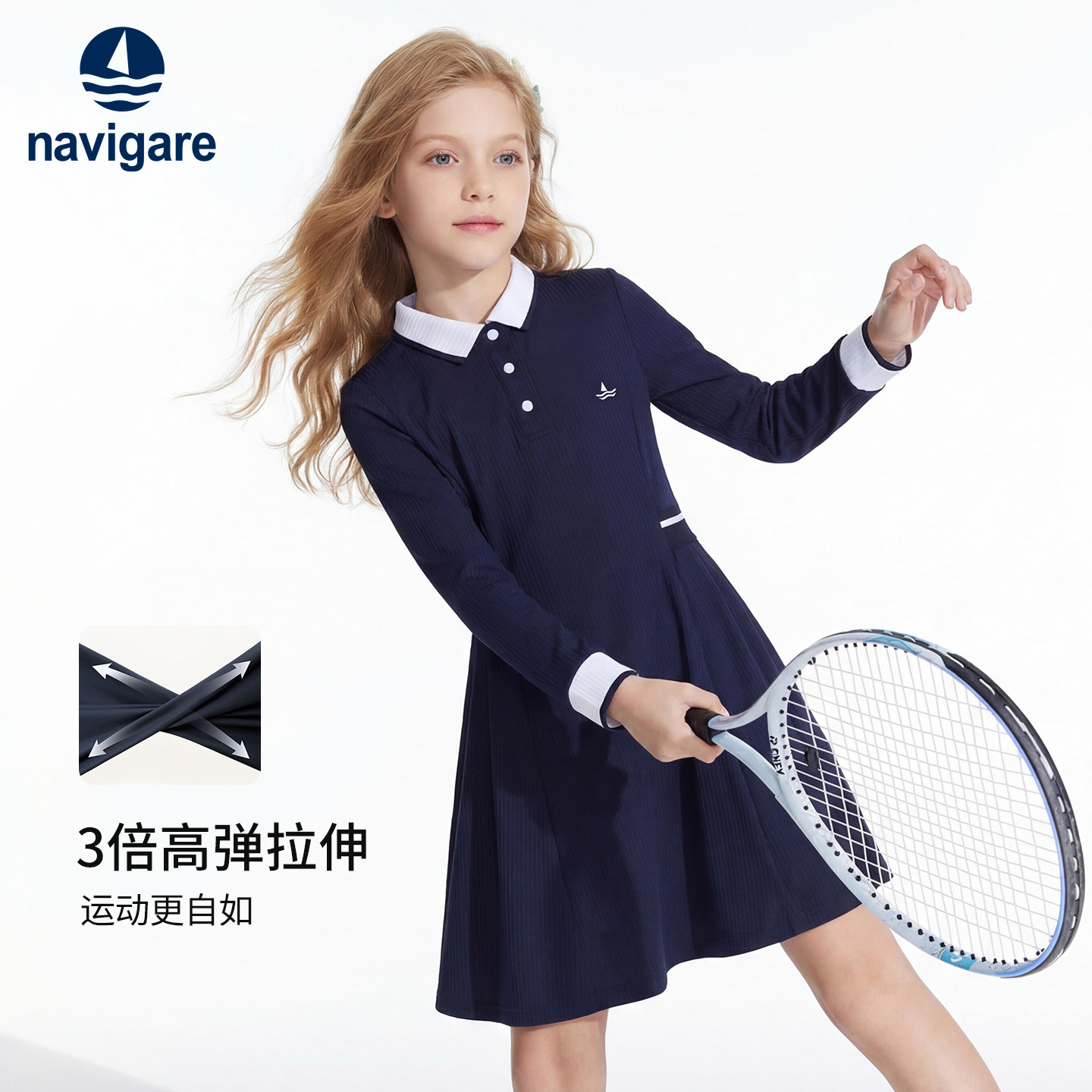 Navigare意大利小帆船女大童学院风翻领连衣裙春秋新款修身百褶裙