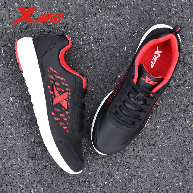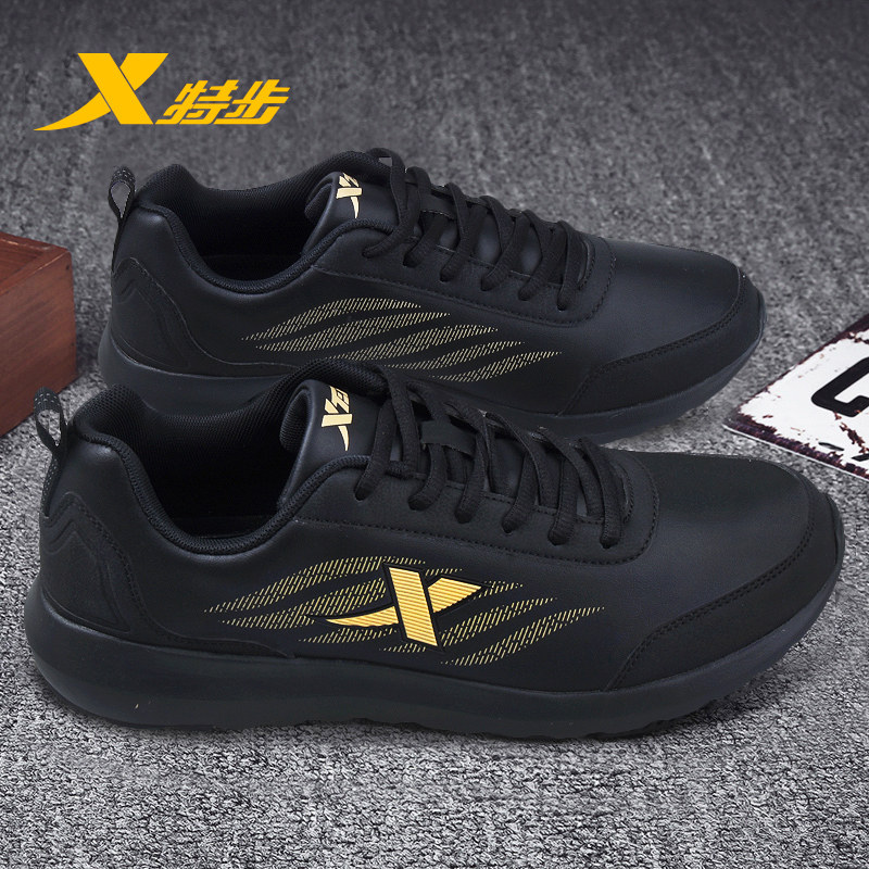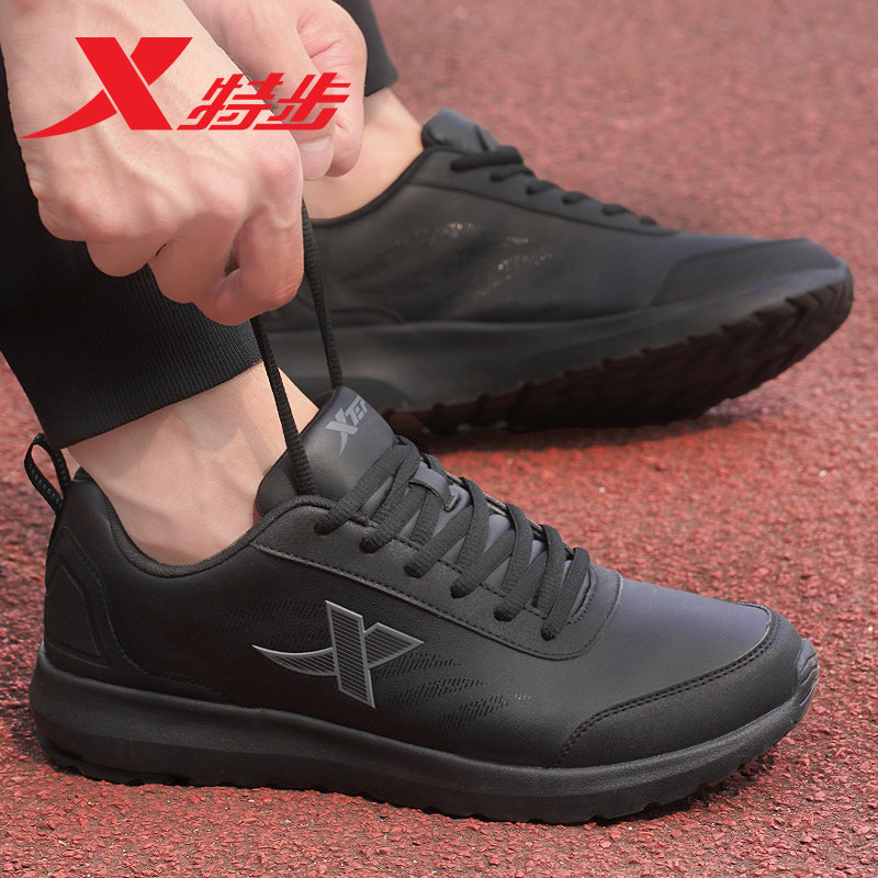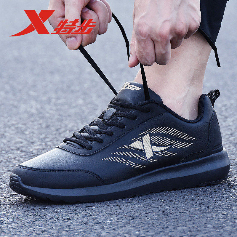 特步男鞋皮面运动鞋秋冬季黑色休闲鞋防泼水跑步鞋子男款爸爸鞋