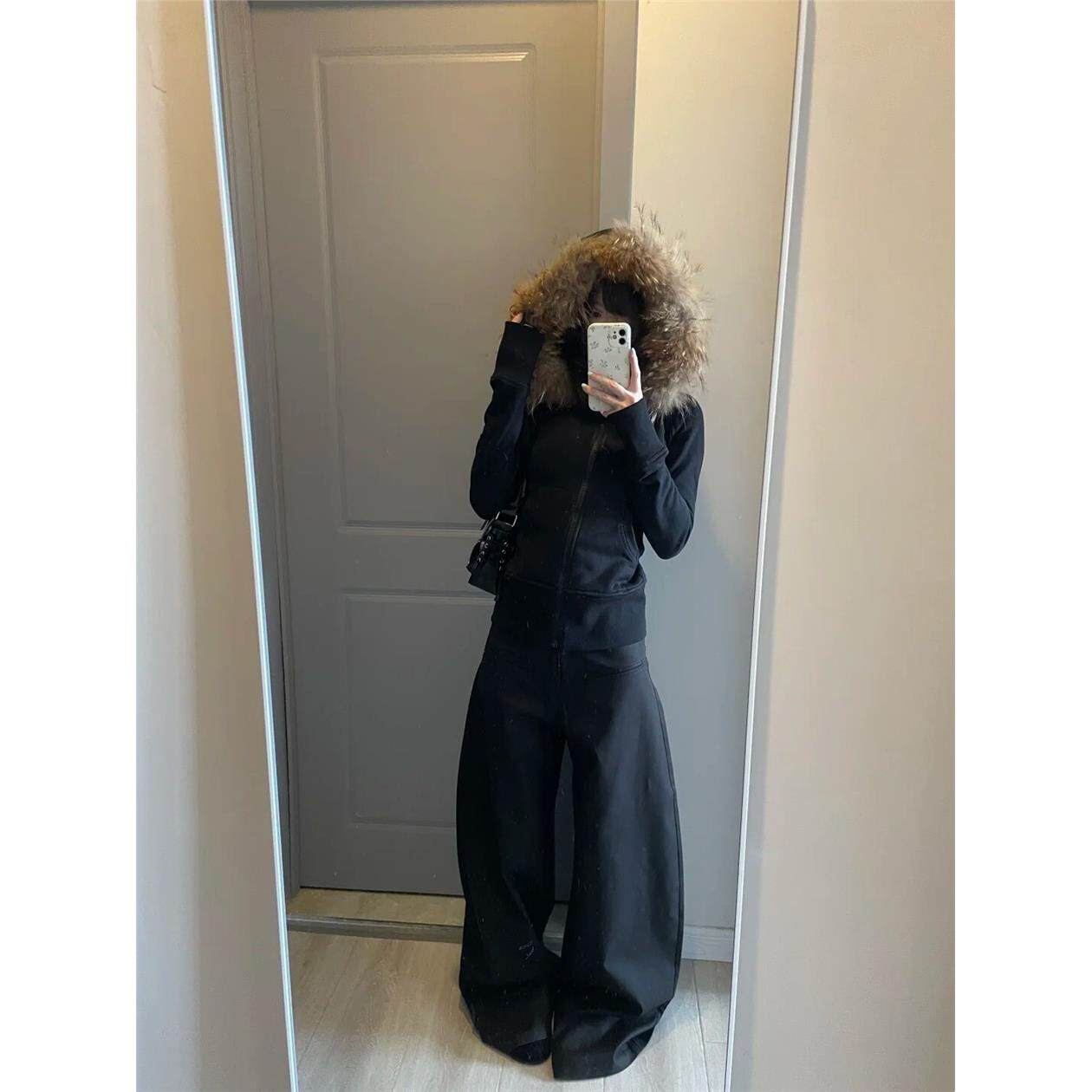 黑色修身毛领卫衣外套女款秋冬天短款收腰冬季韩系早秋季穿搭上衣