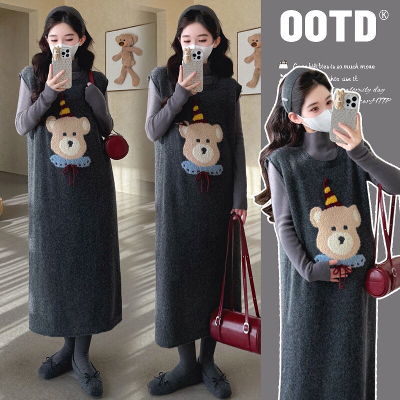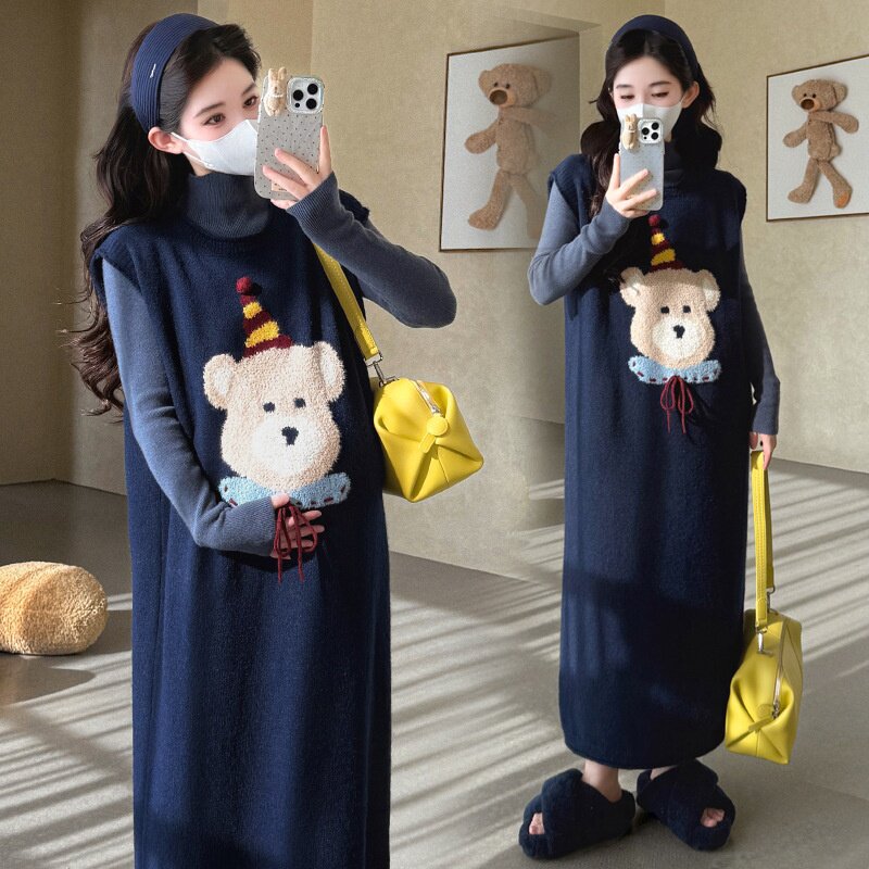 孕妇装2025秋冬新款韩版时尚刺绣卡通小熊毛衣2件套孕妇连衣裙