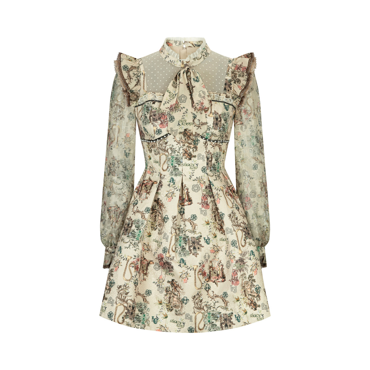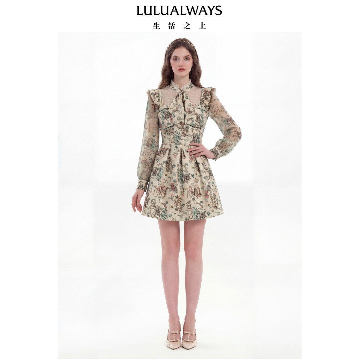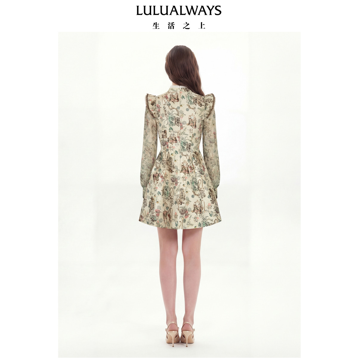 LULUALWAYS我爱露露26春季新款复古优雅提花收腰长袖短款连衣裙