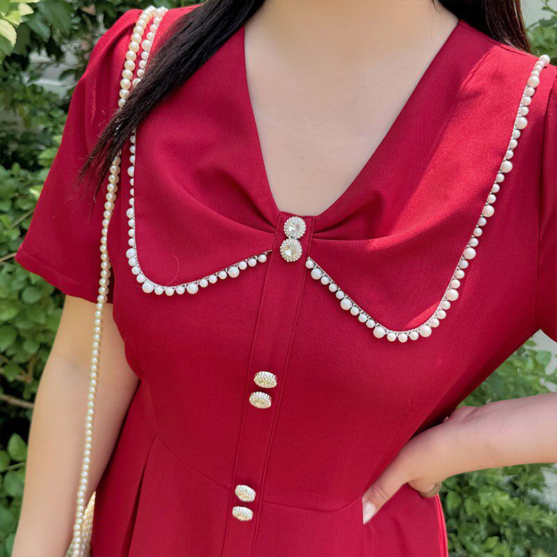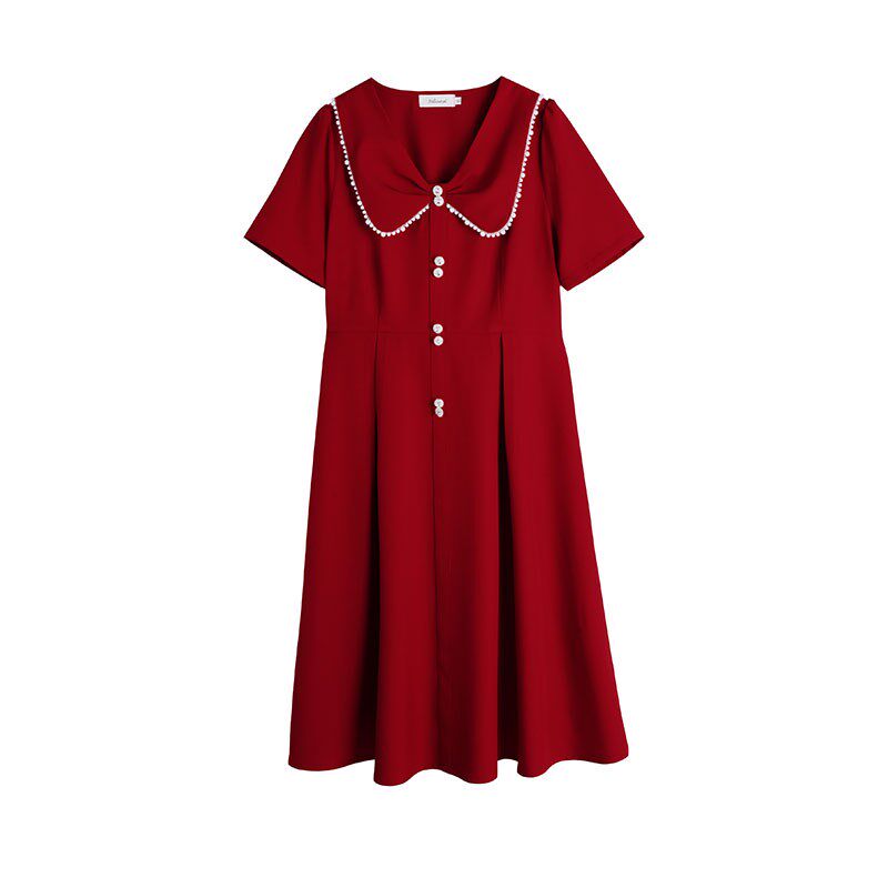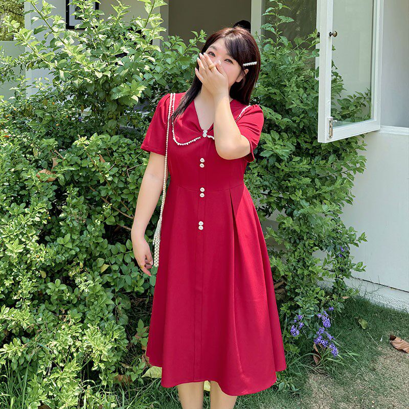 红色连衣裙2025夏季新款220斤胖mm大码气质V领收腰显瘦敬酒服裙子