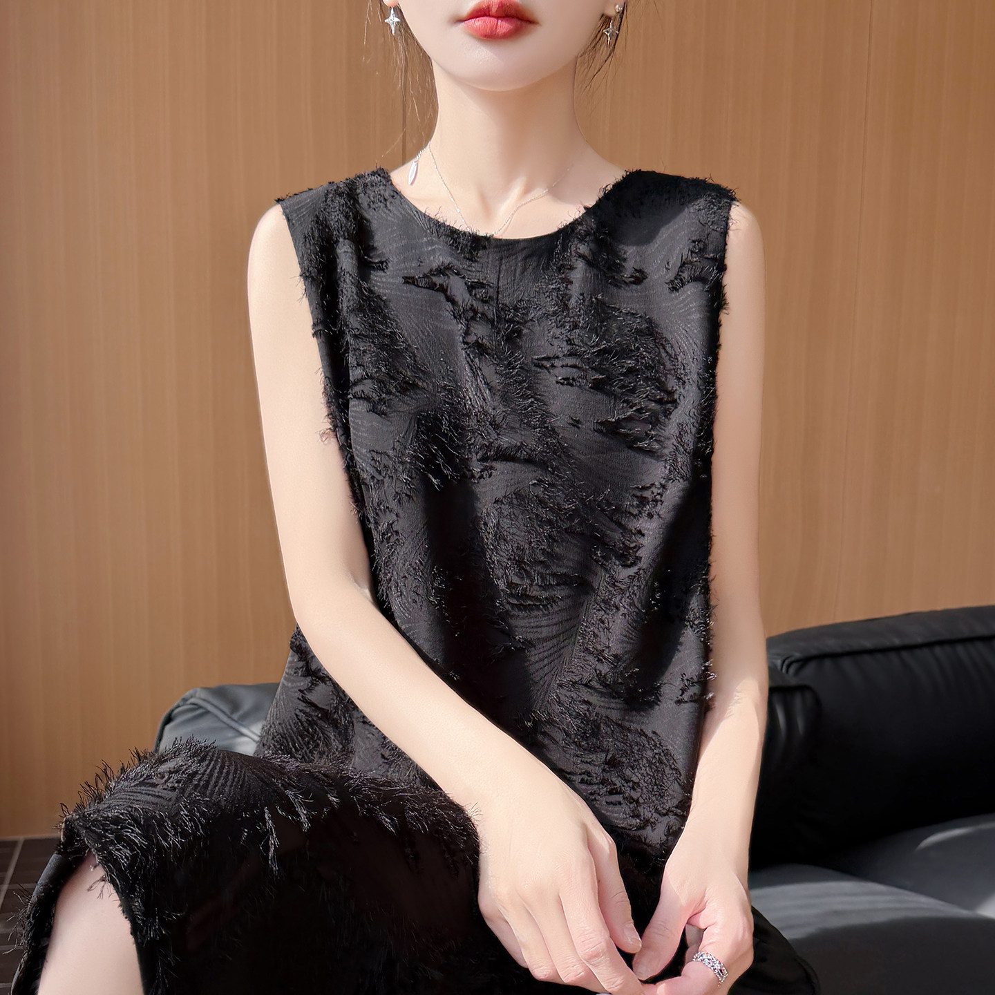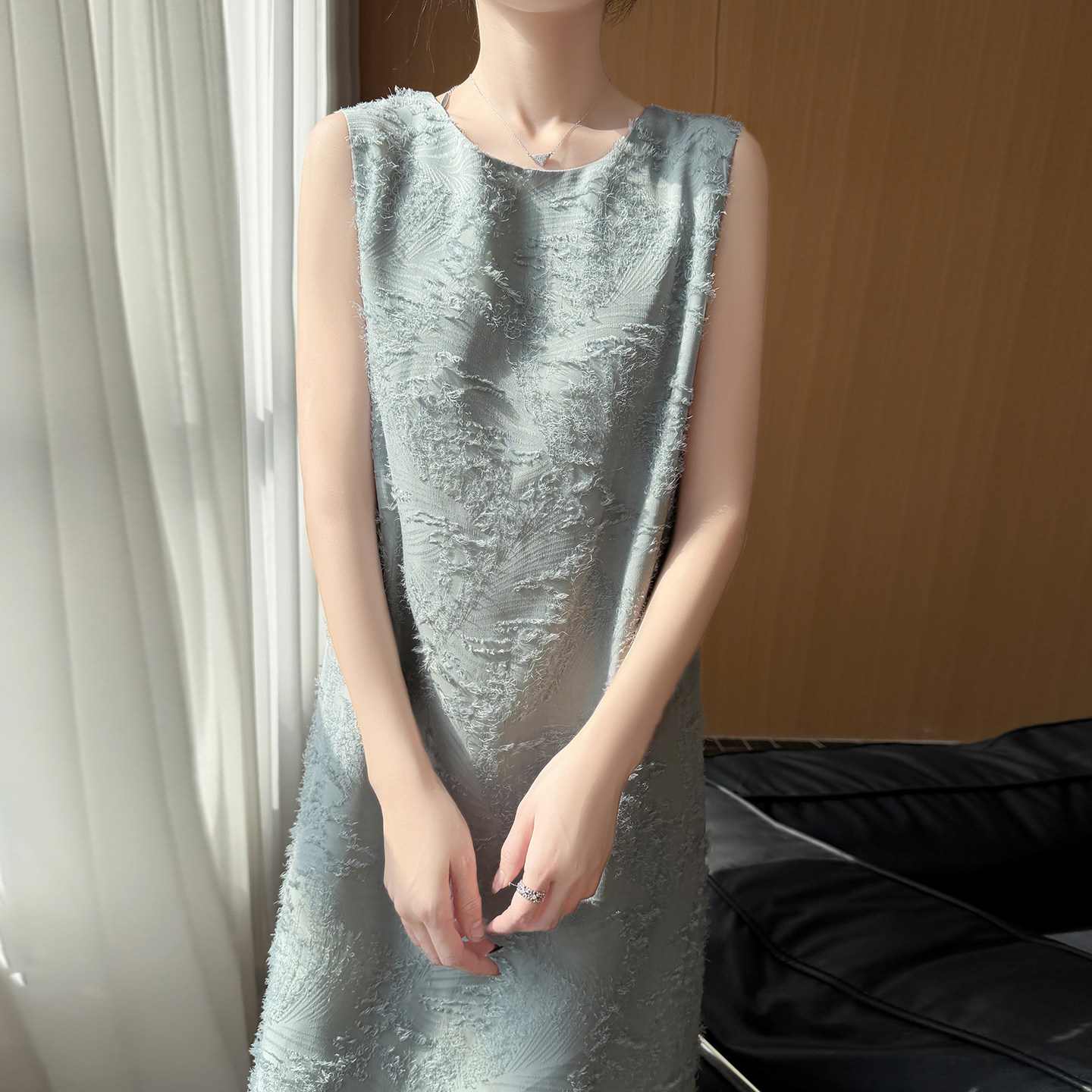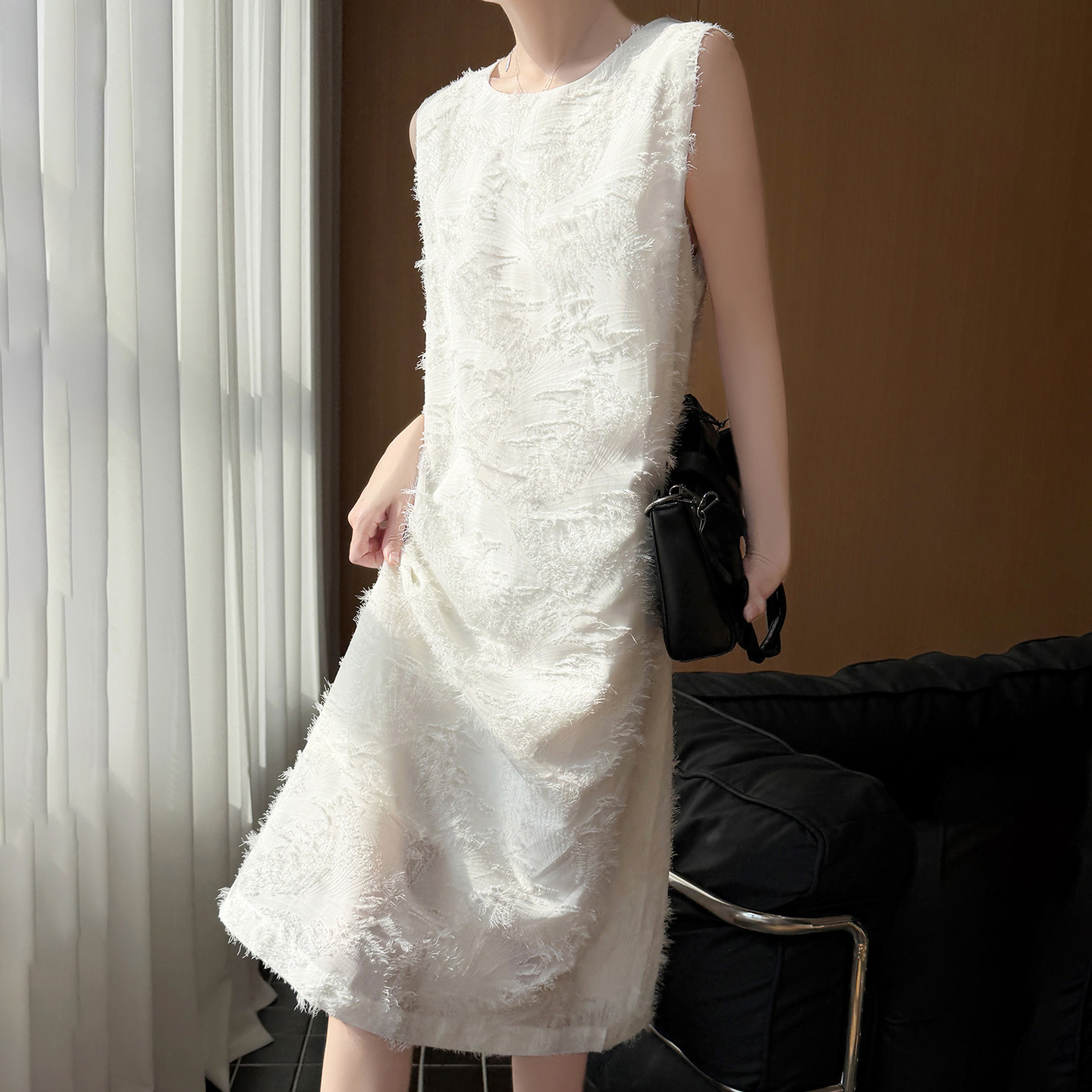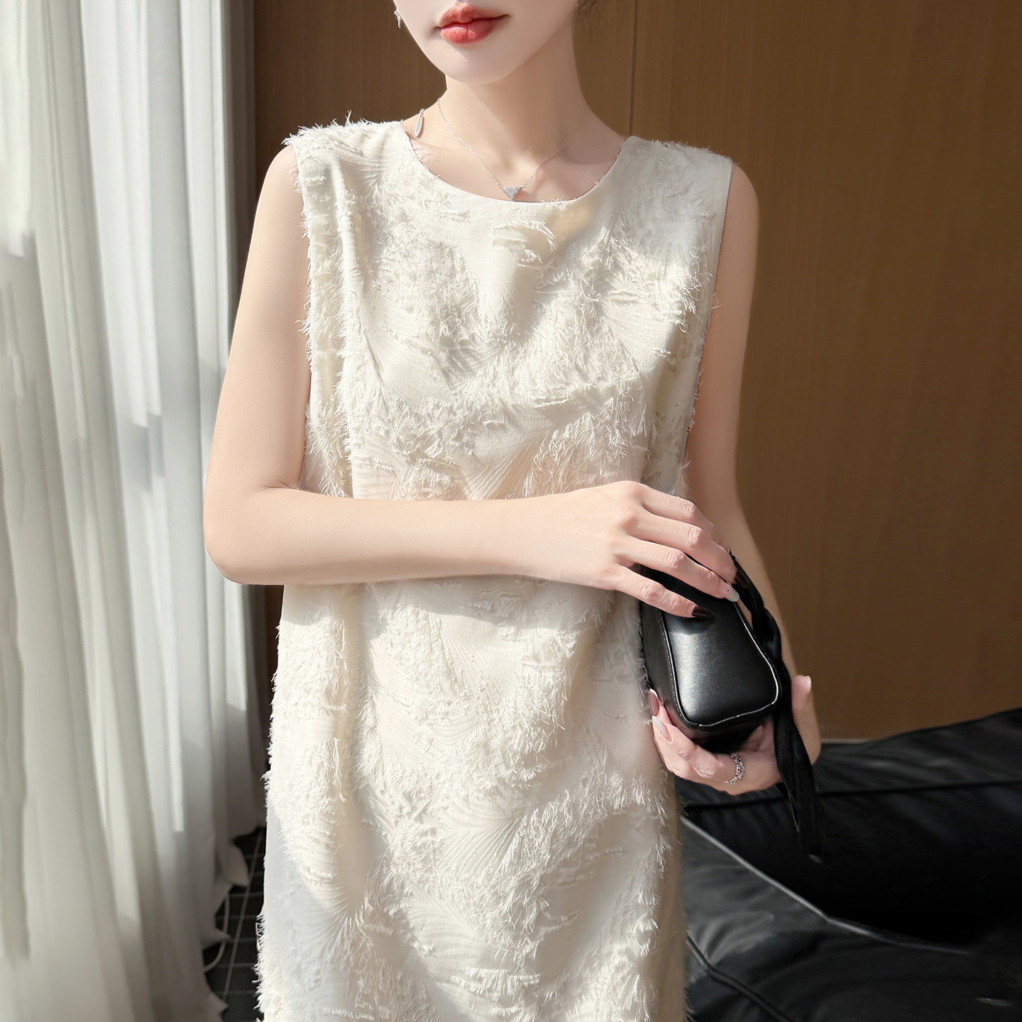 轻奢无袖流苏圆领白色连衣裙女夏季新款直筒裙高级感显瘦背心长裙