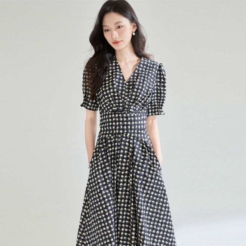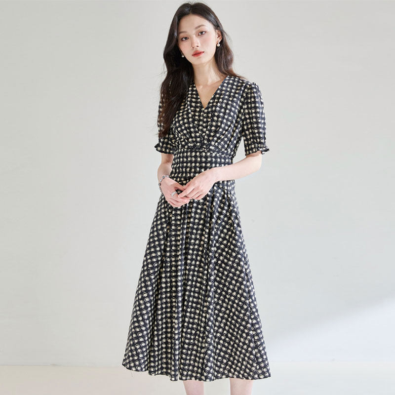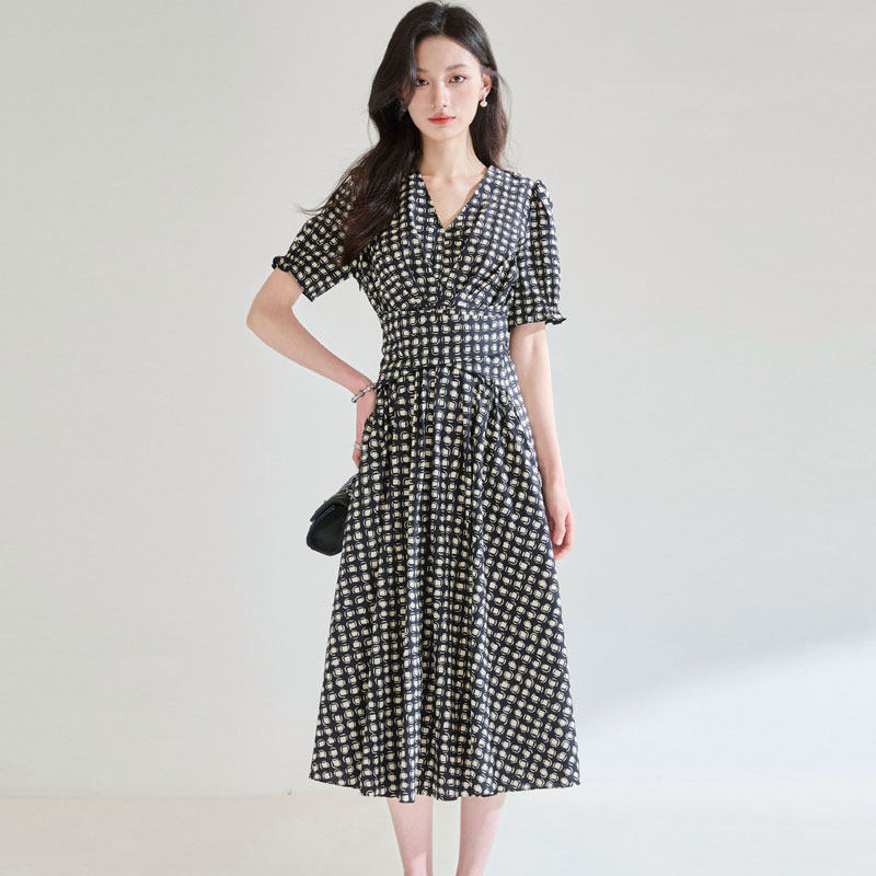 迪奥法式连衣裙夏2026新款轻奢V领格纹短袖中长裙高级感纯棉A字裙