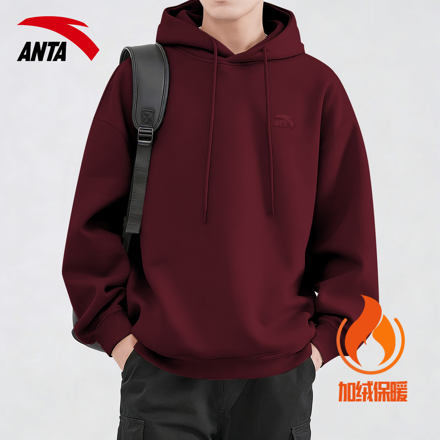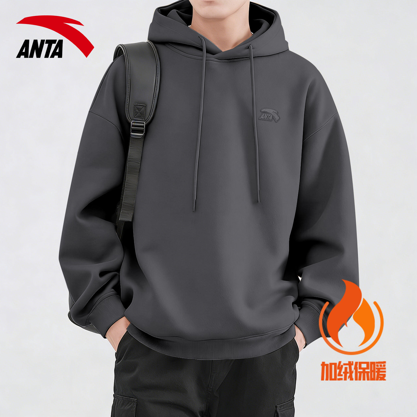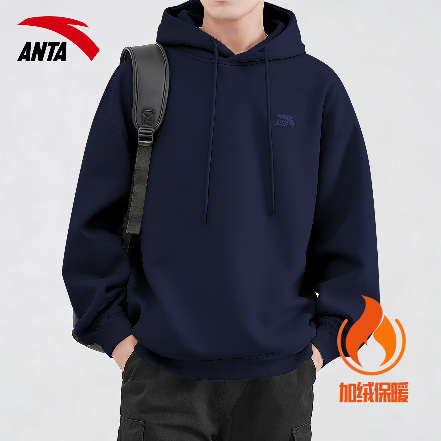 安踏加绒加厚连帽卫衣男冬季青少年宽松大码保暖休闲运动套头长袖