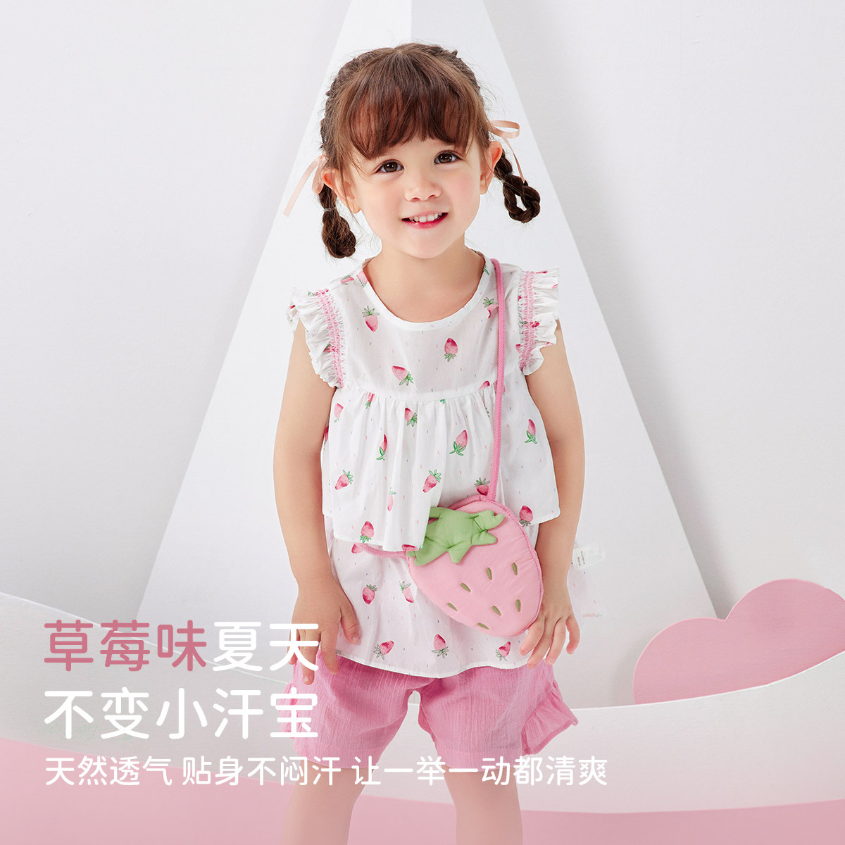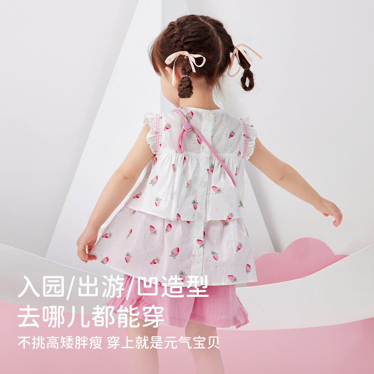 311线报网描述:草莓印花点缀 压褶做旧裤型 送小挎包