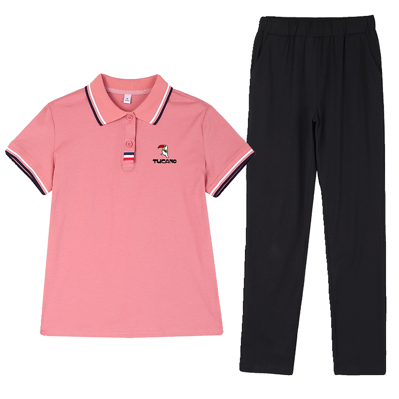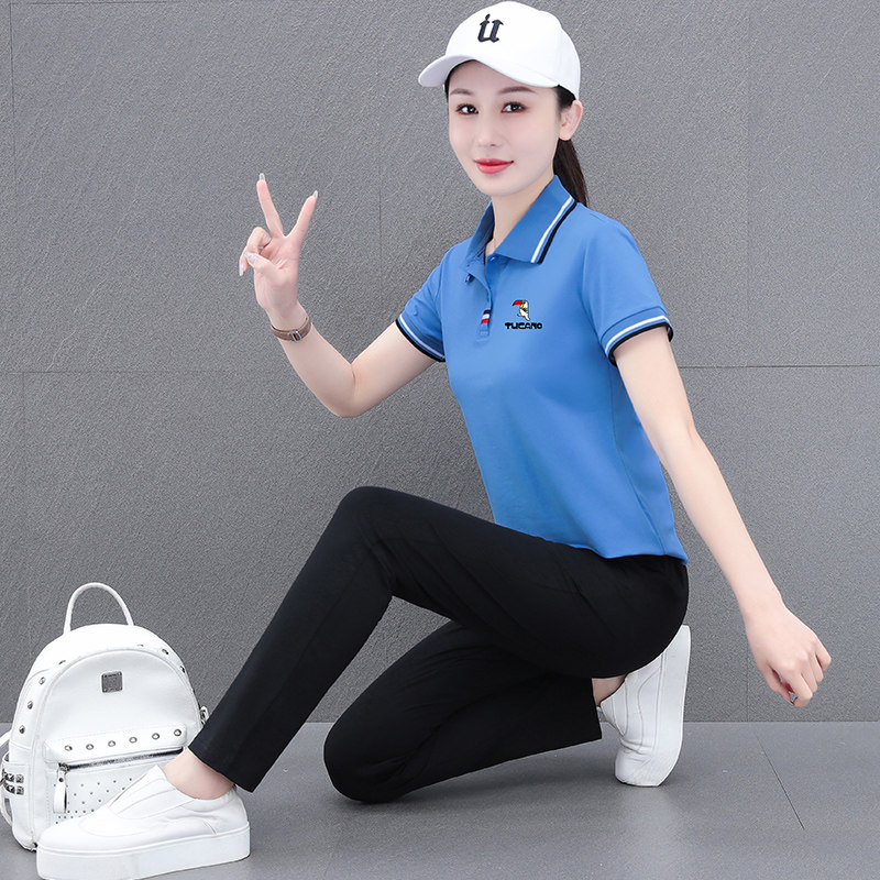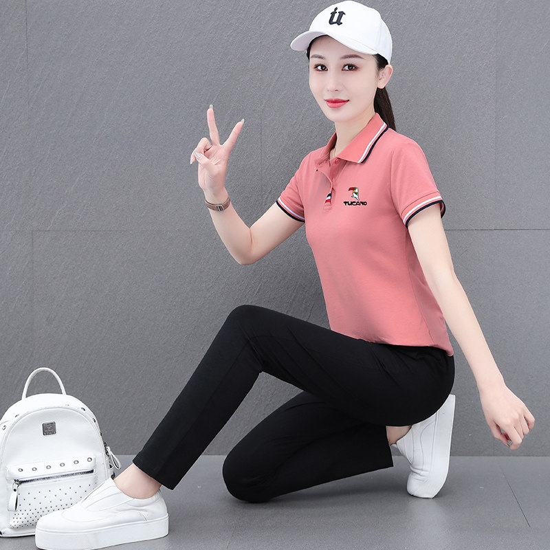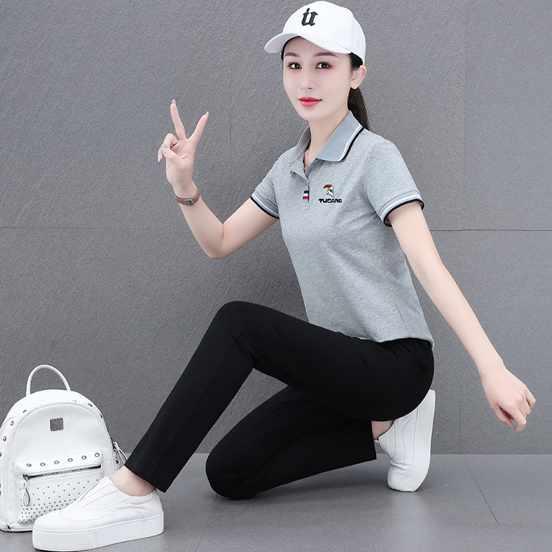 啄木鸟纯棉休闲运动套装女2026夏季妈妈时尚polo衫短袖长裤两件套