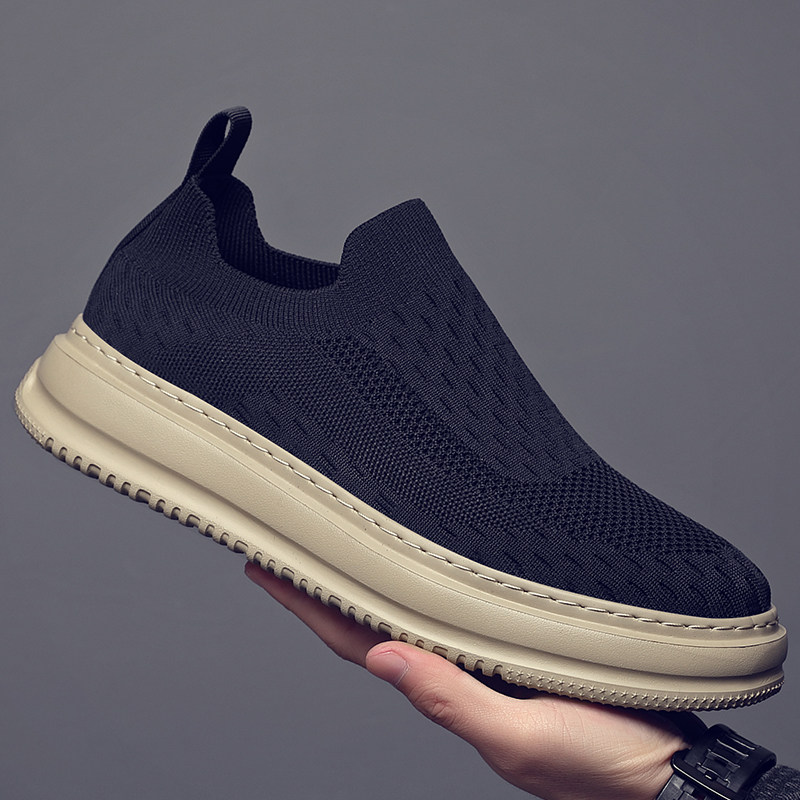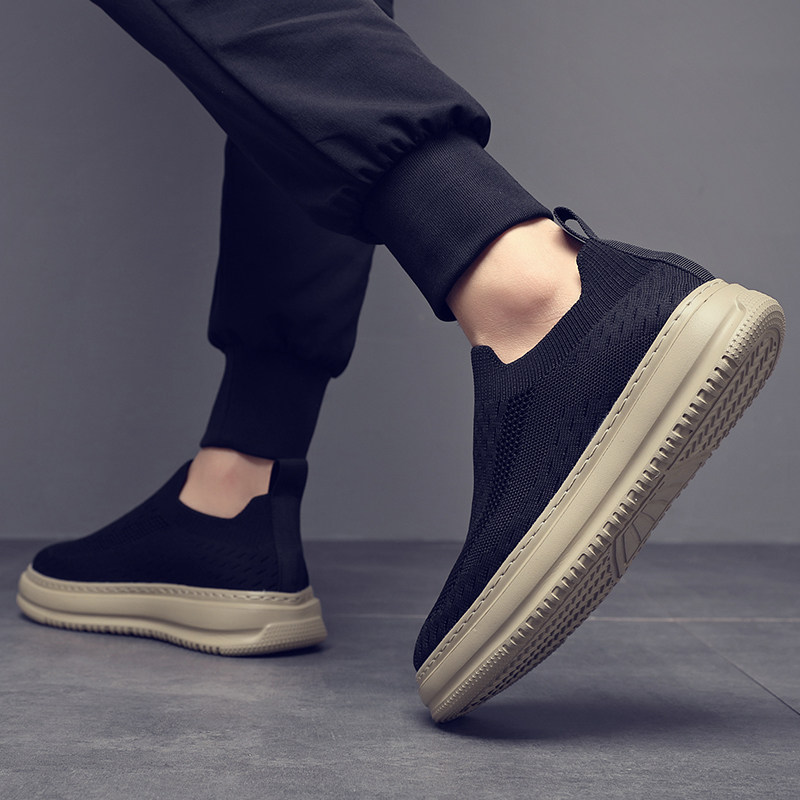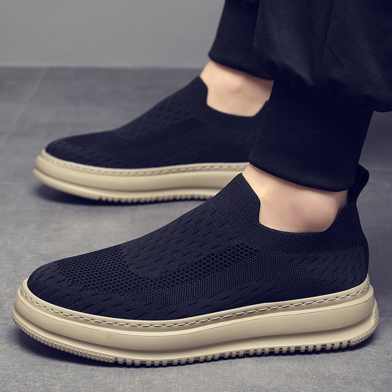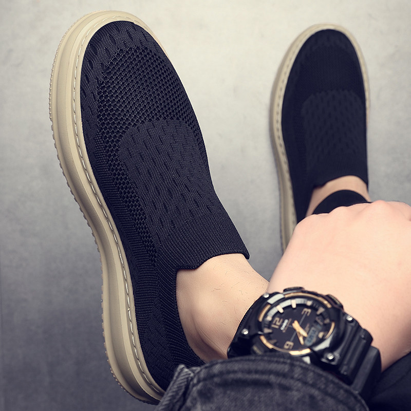 夏季男鞋透气薄款飞织袜子鞋黑色休闲布鞋厚底轻便一脚蹬懒人鞋男