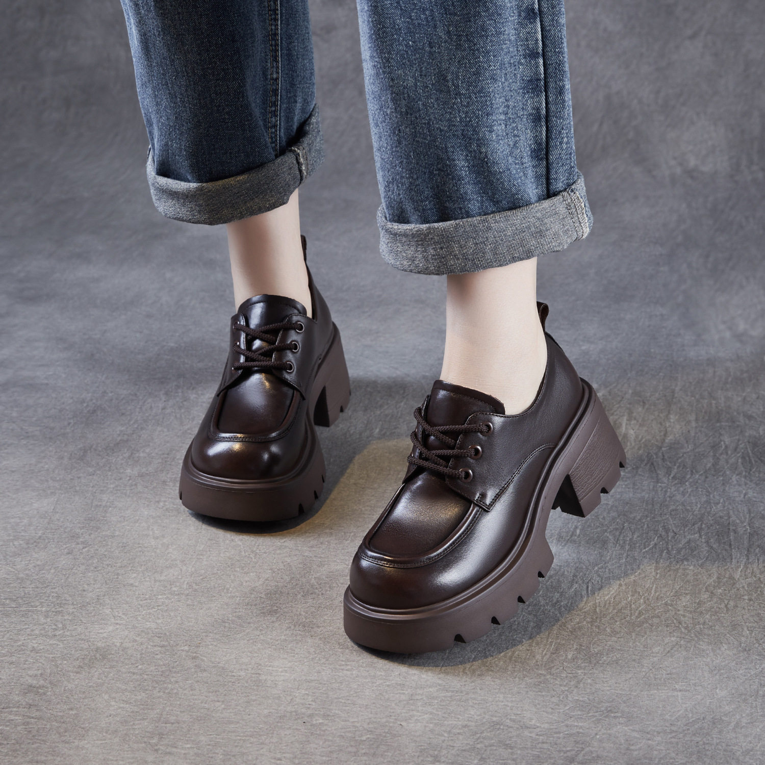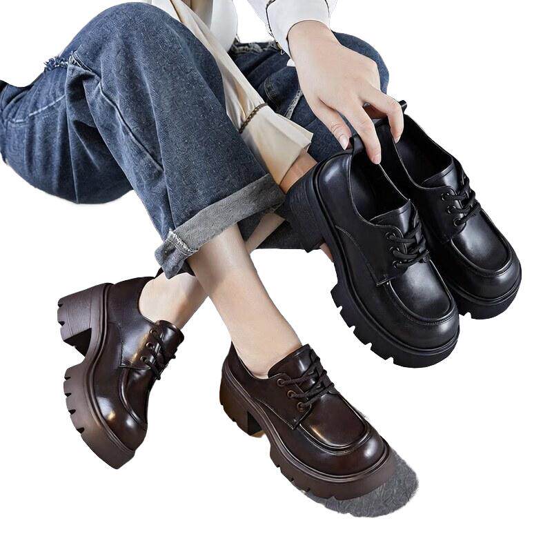 真皮女鞋春秋单鞋新款轻奢擦色厚底小皮鞋英伦复古系带乐福鞋