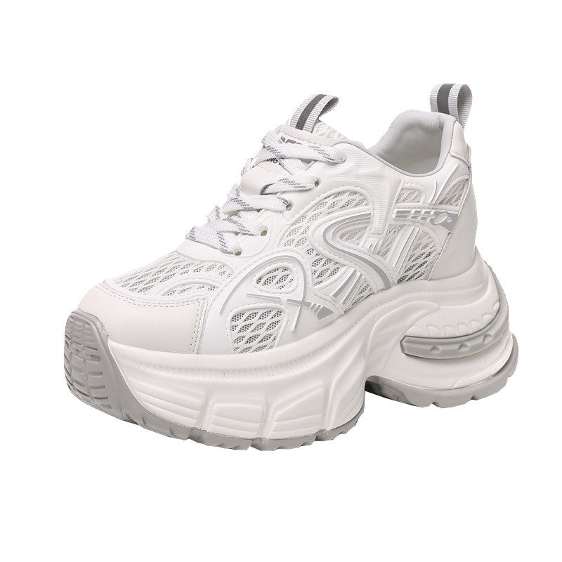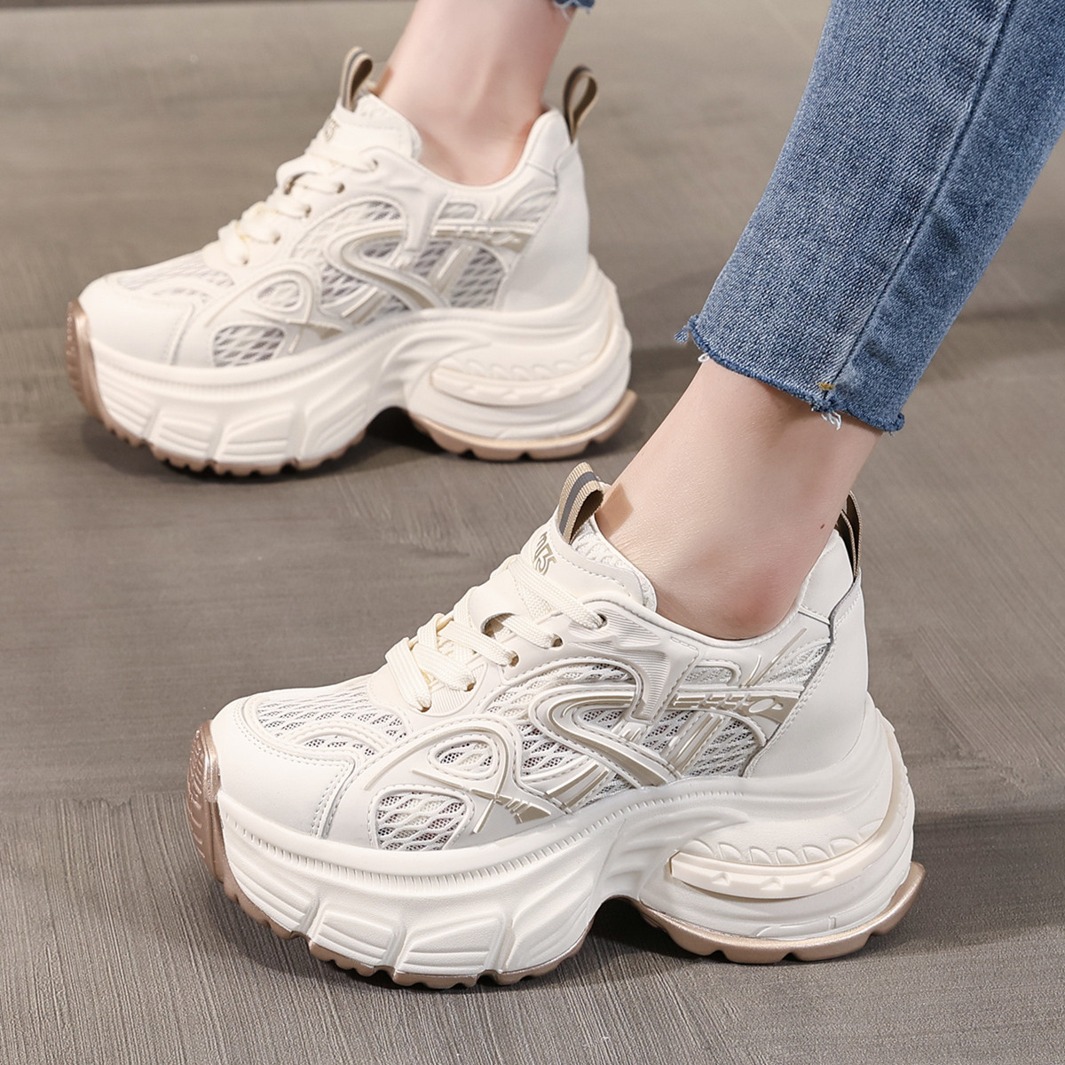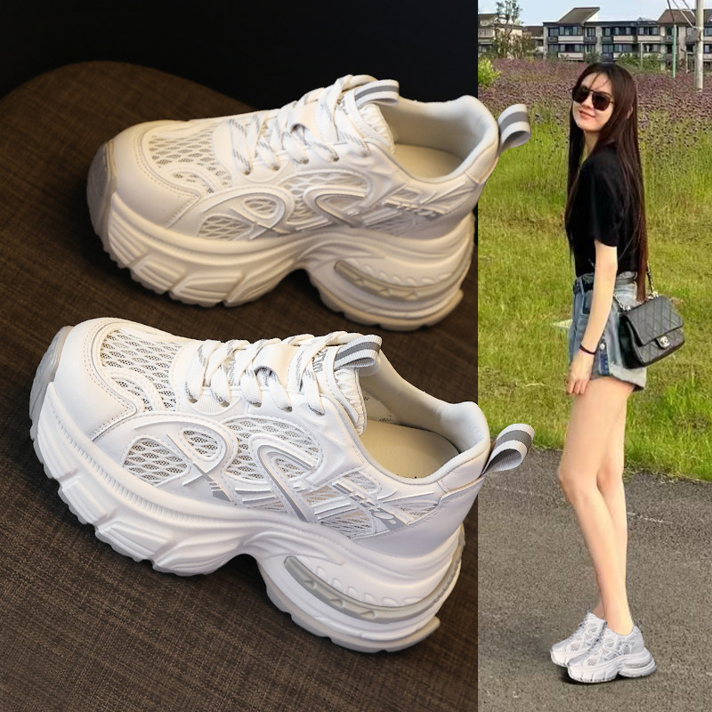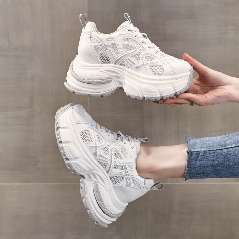 ZFCQ新款网面薄款内增高老爹鞋女真皮2026夏季小个子8cm白色厚底