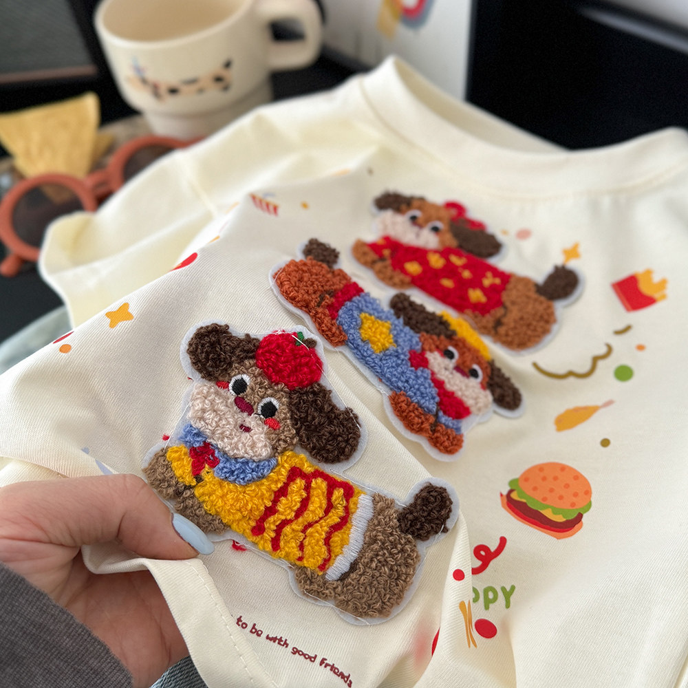 儿童夏季毛巾绣短袖男女童纯棉卡通玩偶T恤宝宝洋气夏装潮流上衣