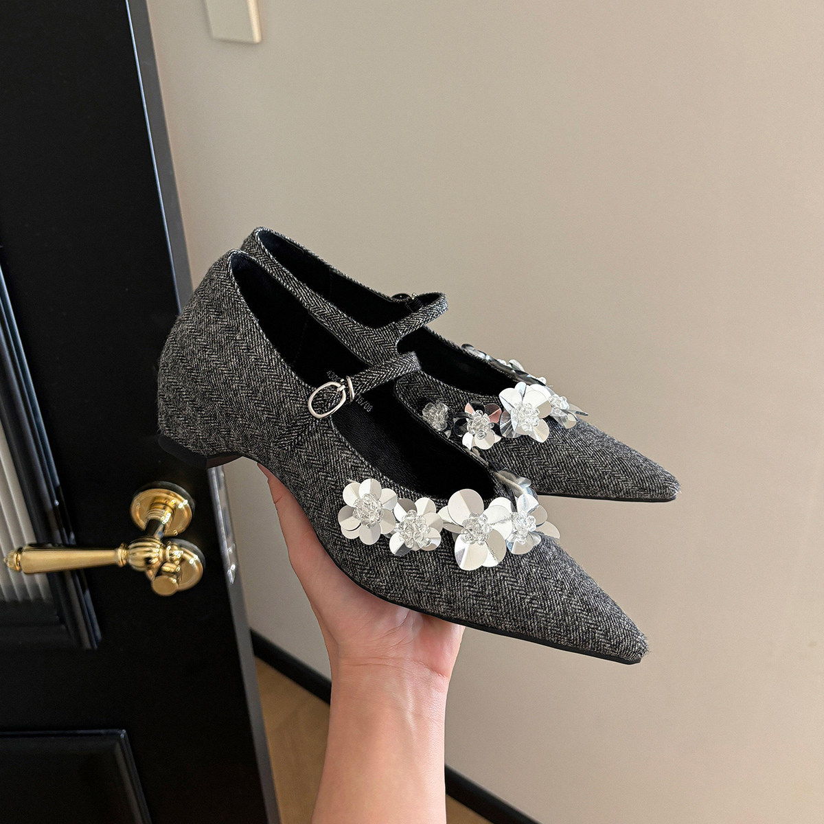 2026新款法式新款内增高尖头单鞋女一字带扣亮皮花朵气质玛丽珍鞋