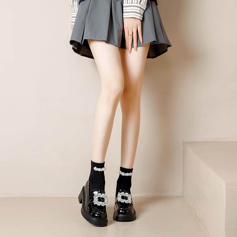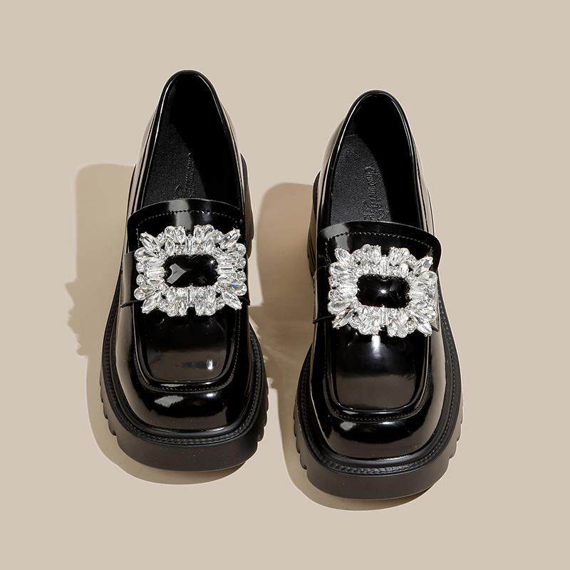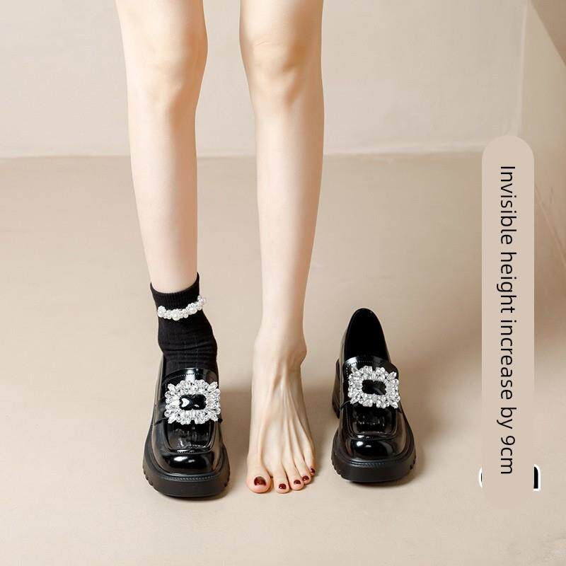 香港真皮内增高厚底乐福鞋女2025秋冬款水钻粗跟单鞋英伦风小皮鞋