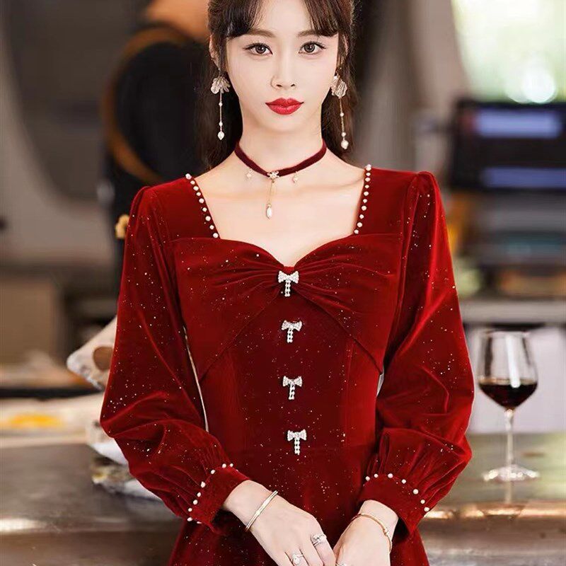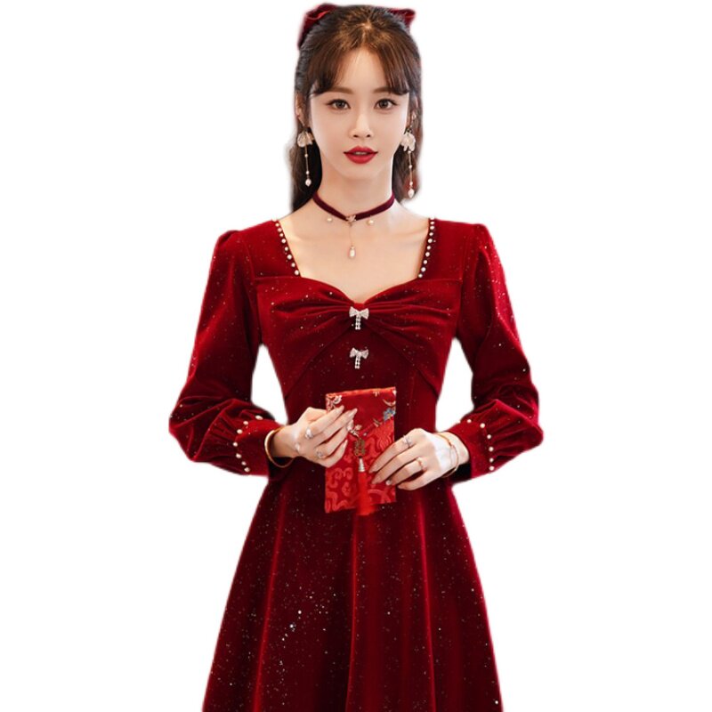 大码冬季敬酒服新娘红色礼服女高级感裙子订婚连衣裙长袖平时可穿