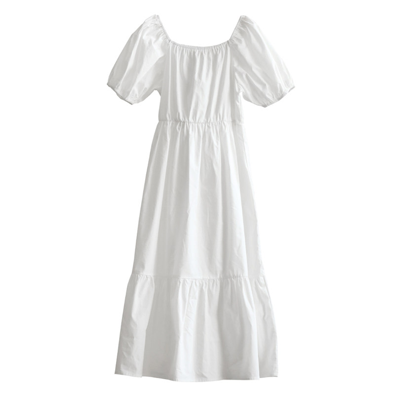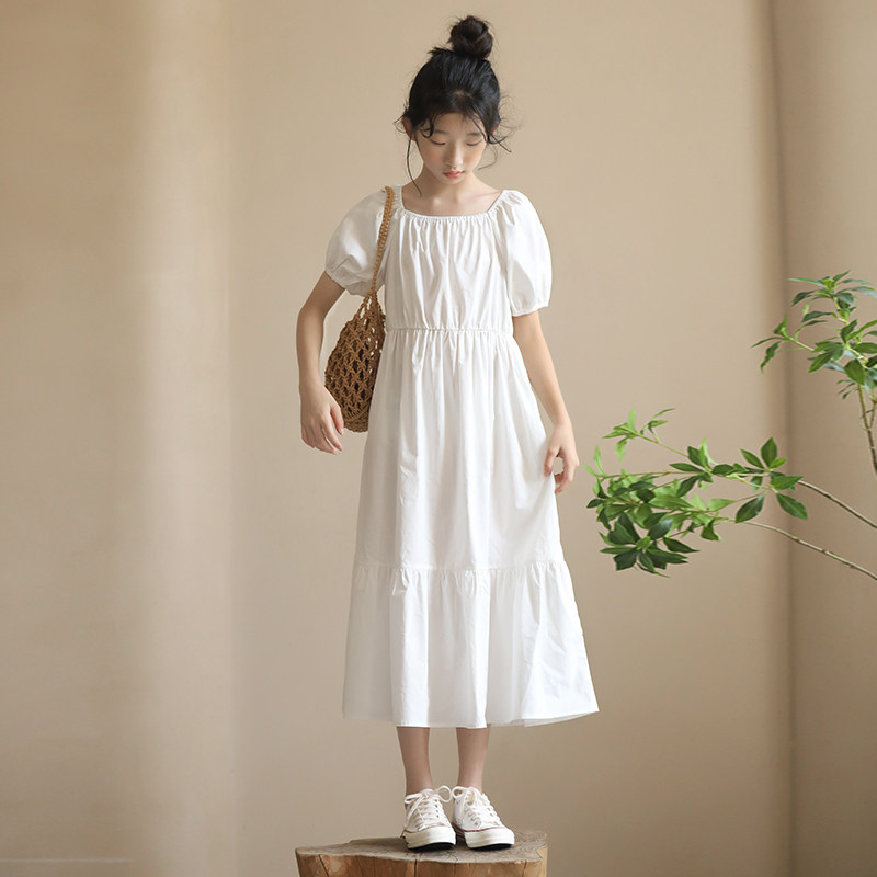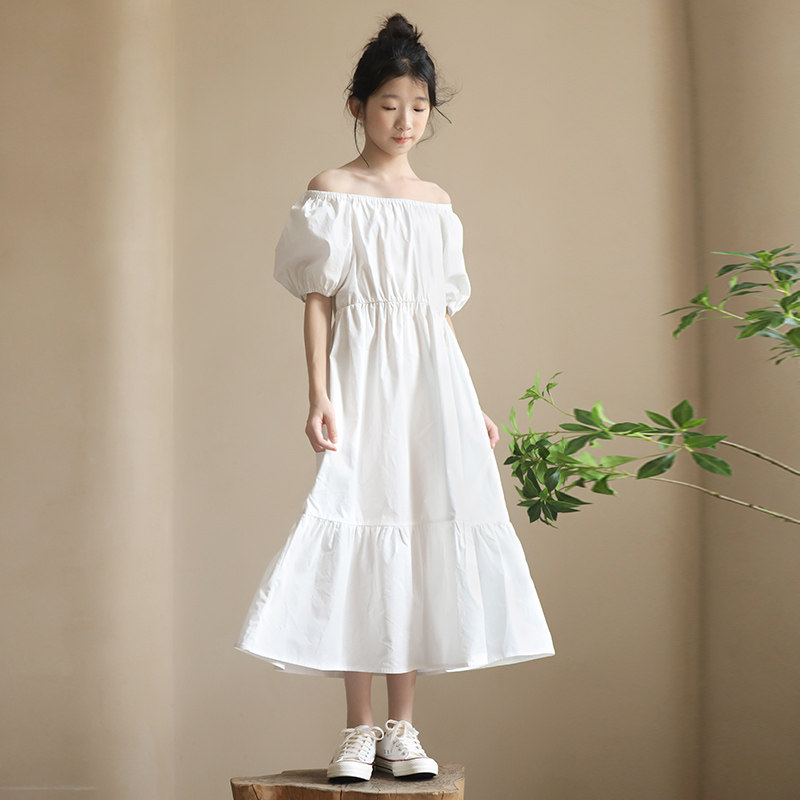 女童白色连衣裙夏季洋气纯棉小清新泡泡袖公主裙女大童一字肩长裙