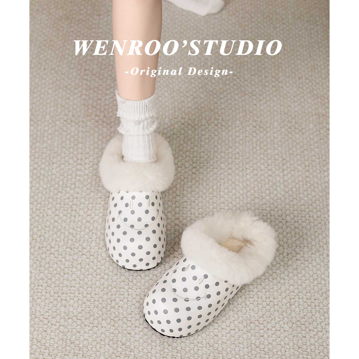 波点刺绣笑脸内增高包头毛毛拖鞋女外穿2025新款白色加绒勃肯棉鞋