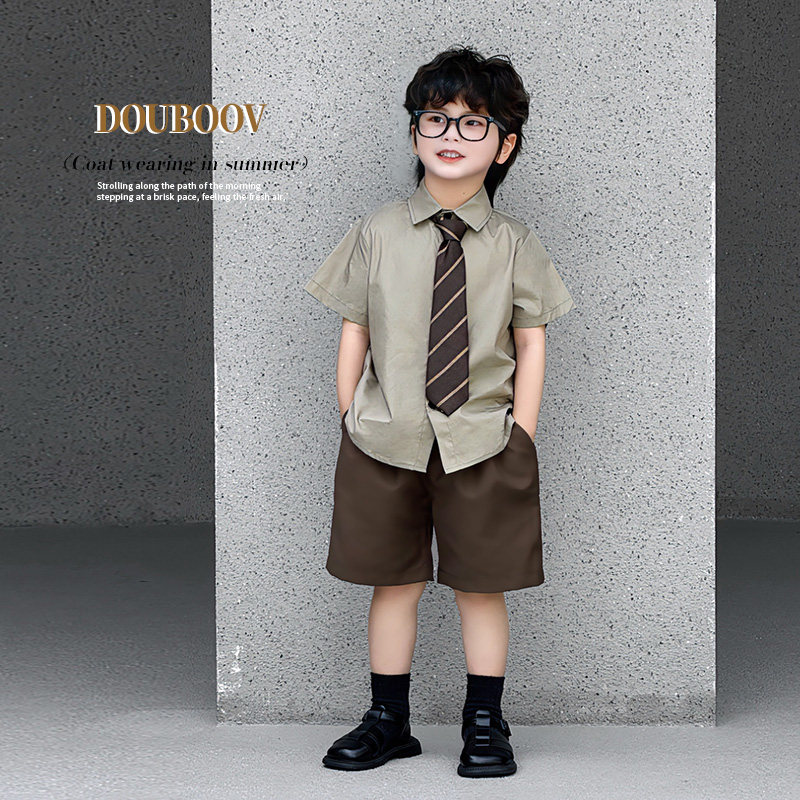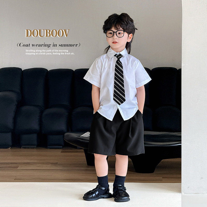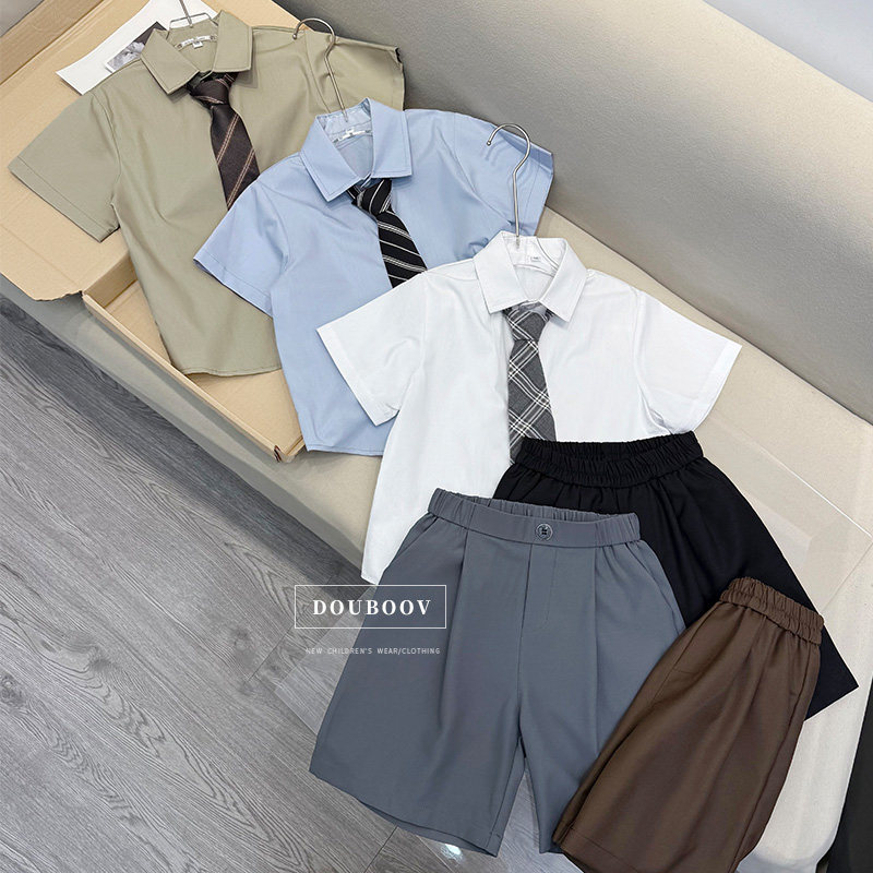 男童学院风夏装2025新款儿童白色短袖衬衫男宝宝时髦夏季薄款套装