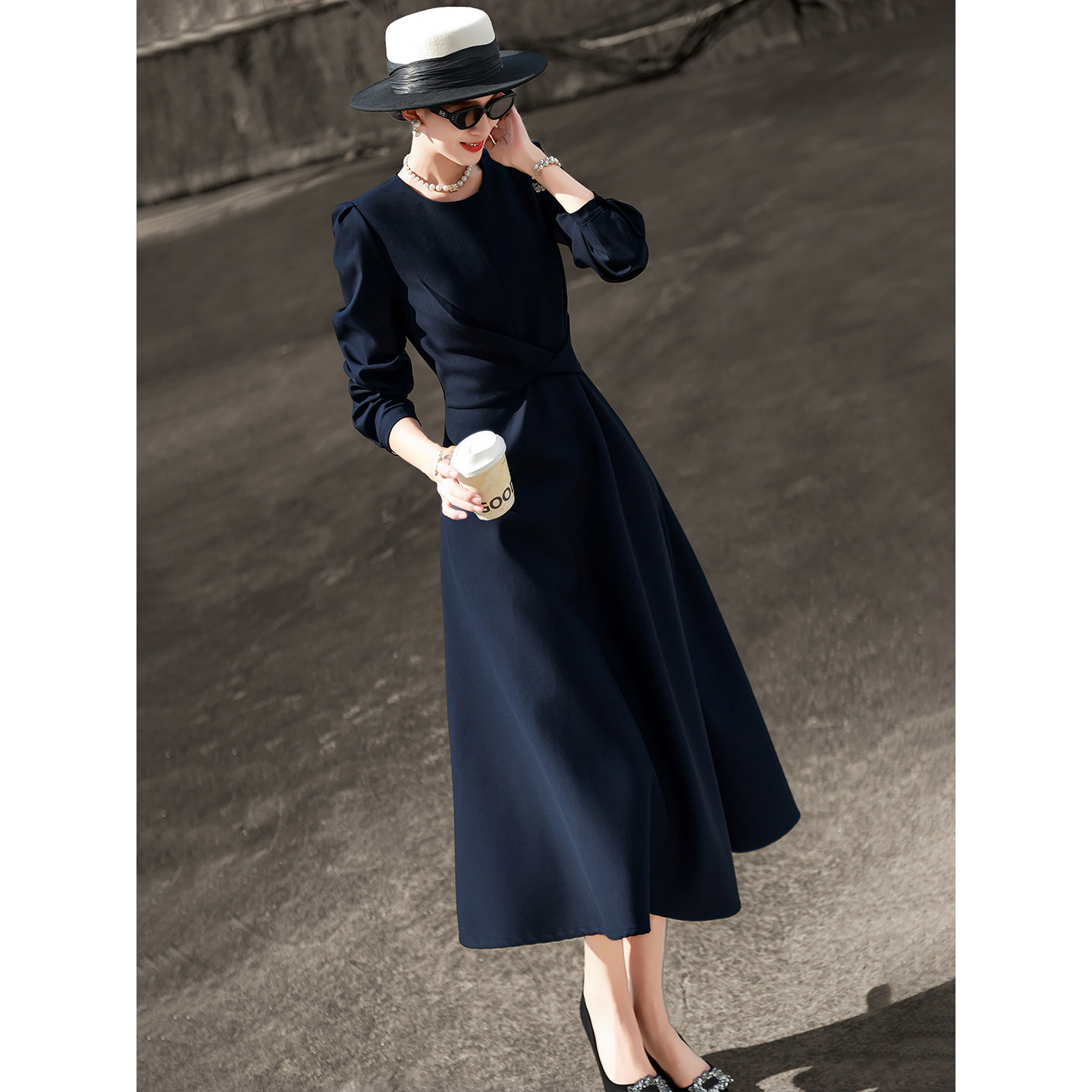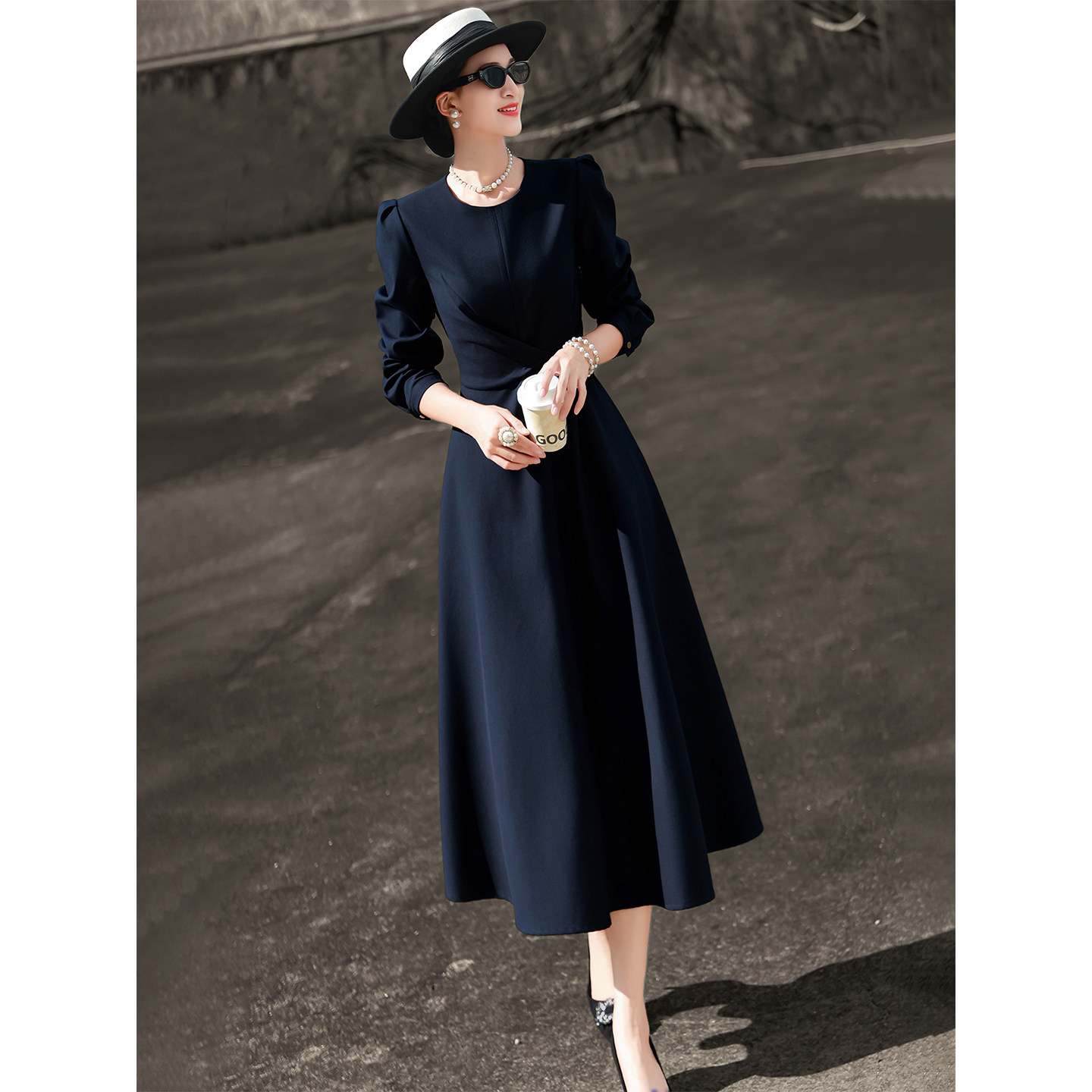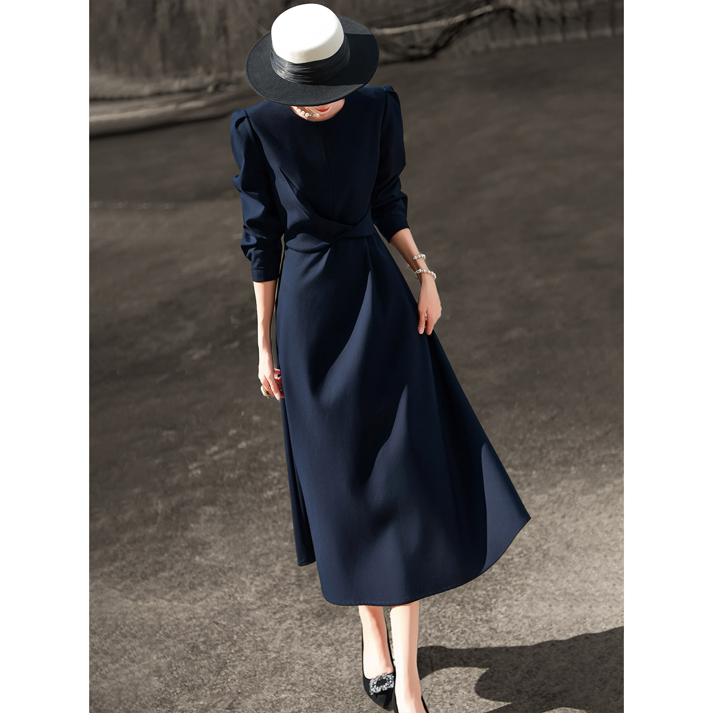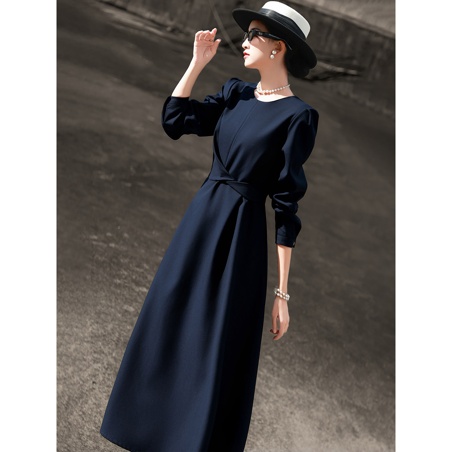 兰瑟儿2026春季新款气质通勤立裁裙子长袖圆领收腰显瘦纯色连衣裙