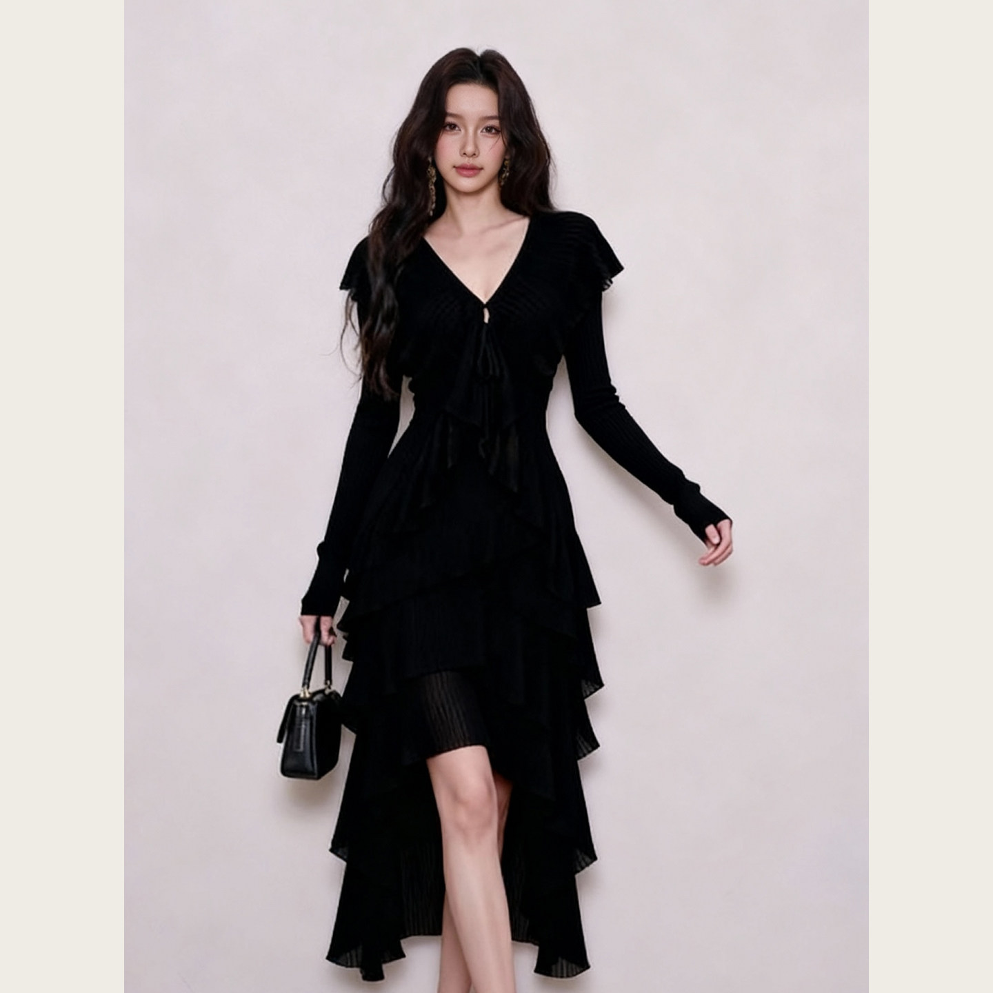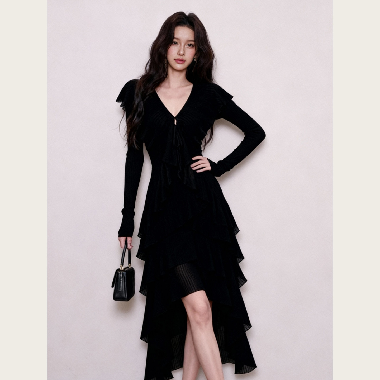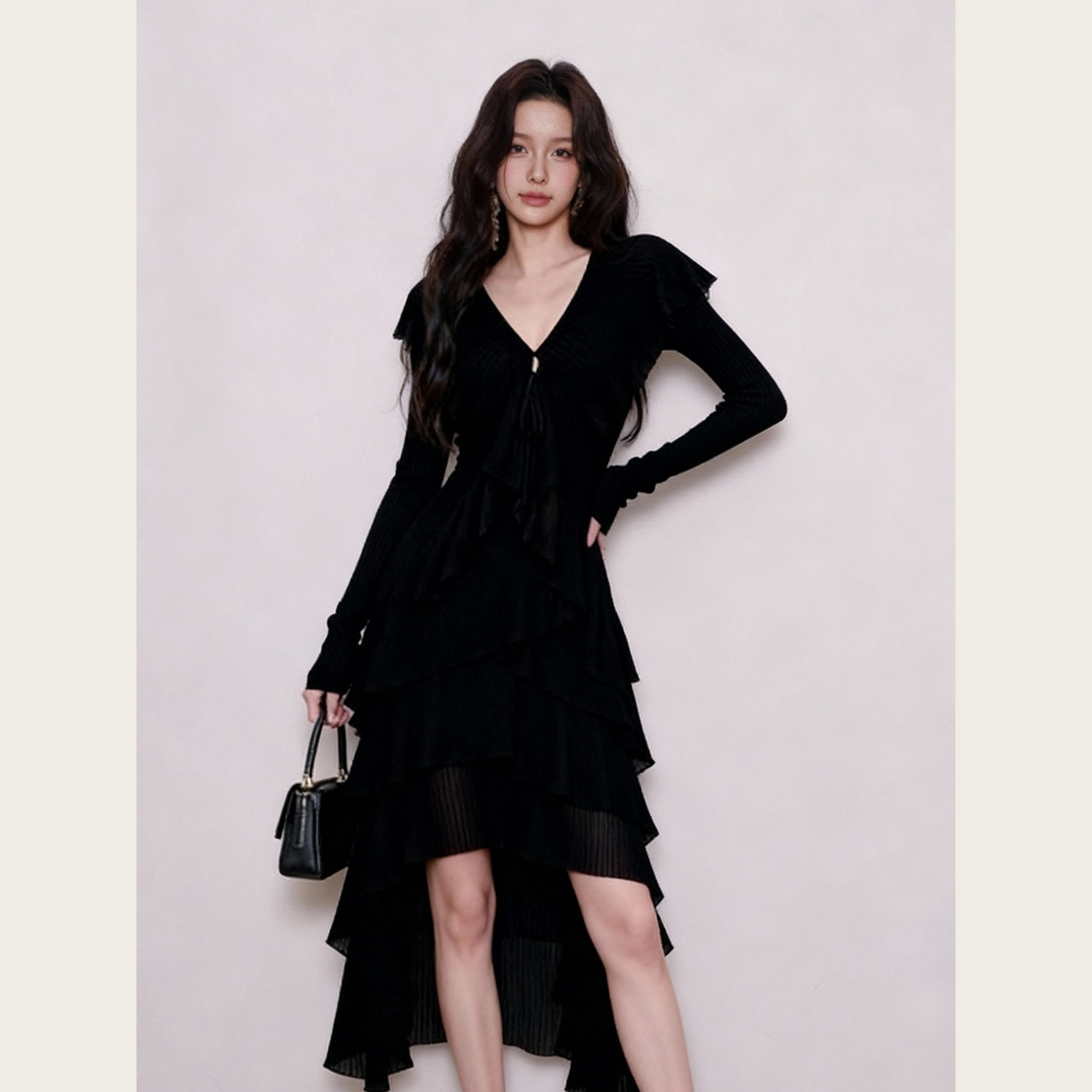 大码胖MM春季新款设计感不规则前短后长连衣裙女独特别致收腰裙子