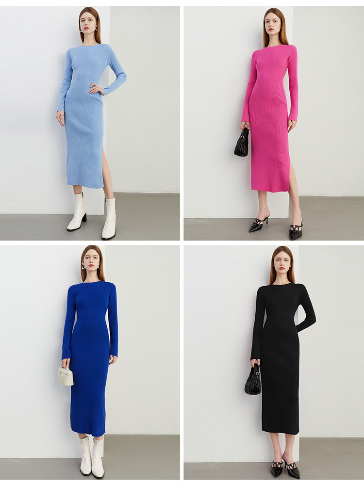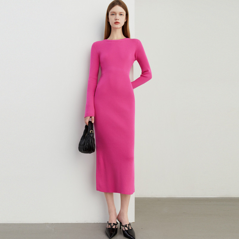 DPLAY秋季气质新款玫红色连衣裙女圆领流行长款针织裙子长袖