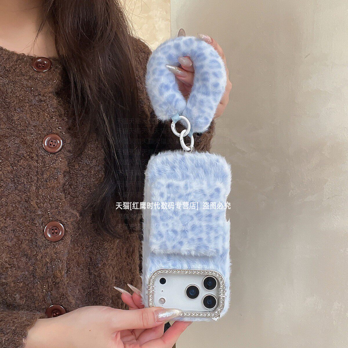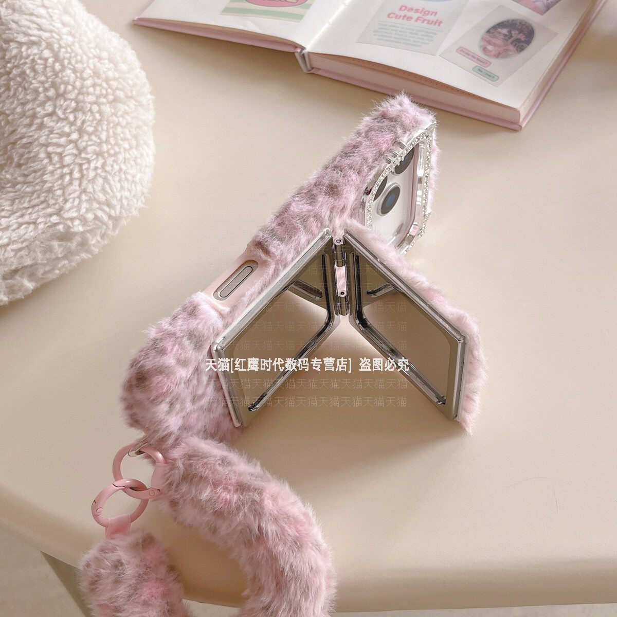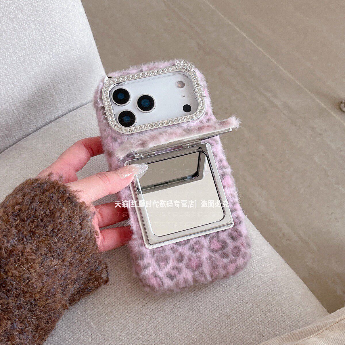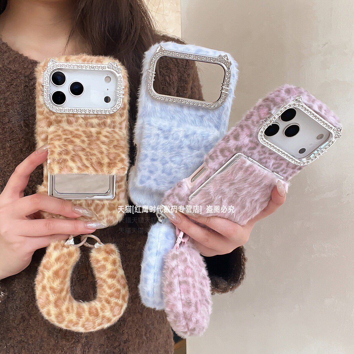 311线报网描述:创意小众冬天毛绒豹纹 翻盖镜子支架