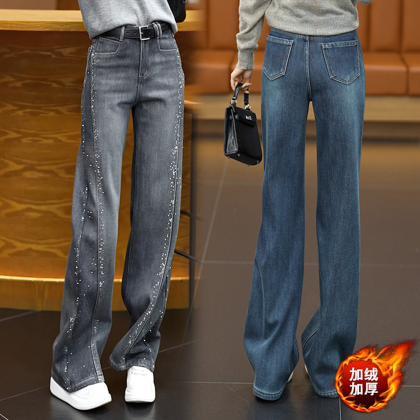 灰色烫钻直筒牛仔裤女春秋款2026年新款高腰宽松窄版显瘦阔腿裤子