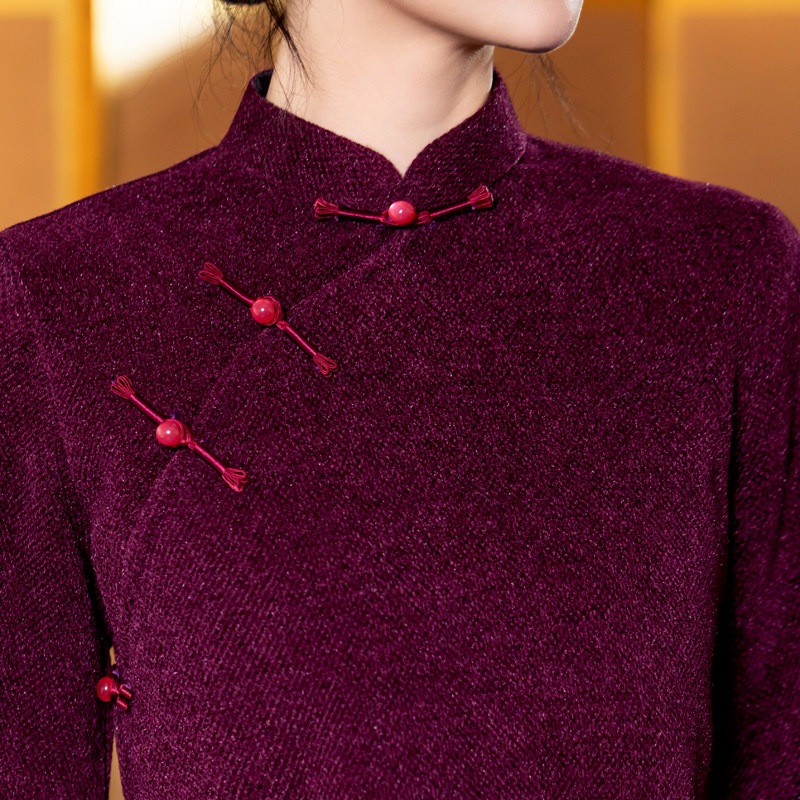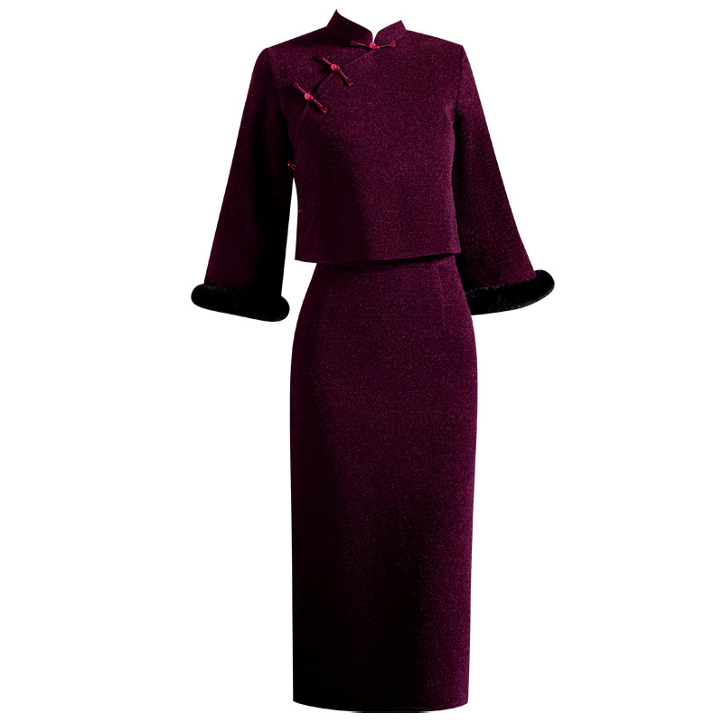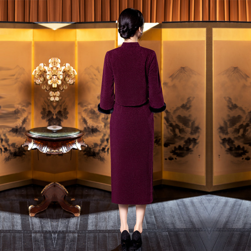 紫色加厚保暖旗袍冬季连衣裙小个子妈妈水貂绒高端礼服2件套女装