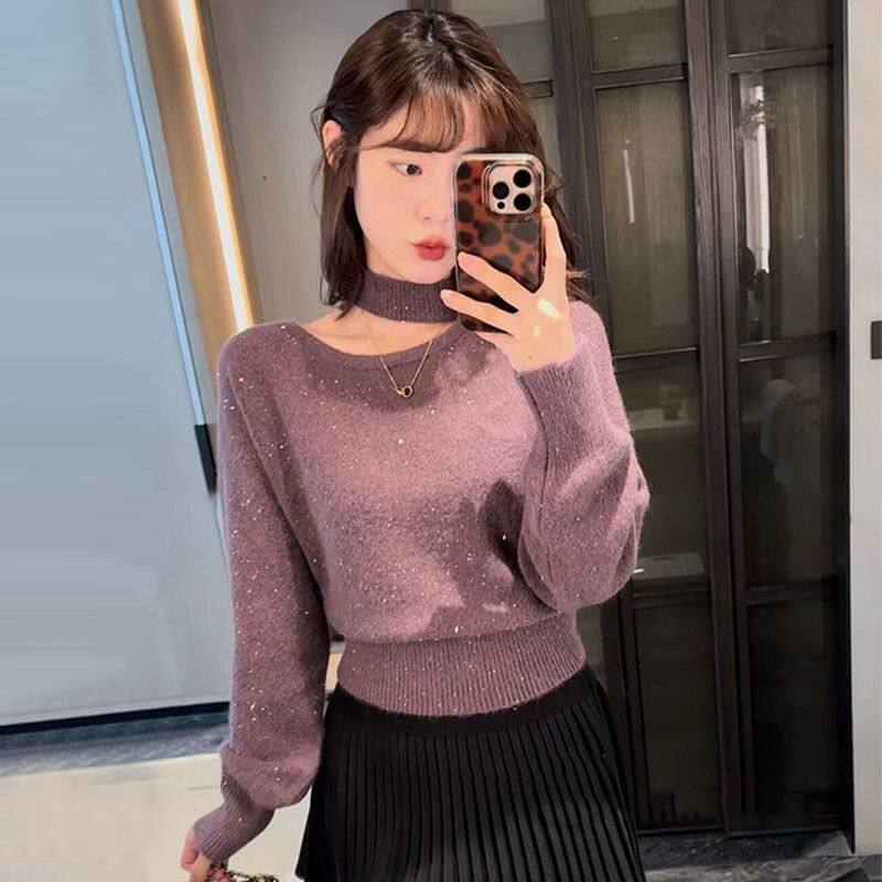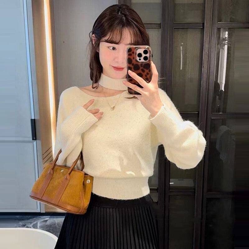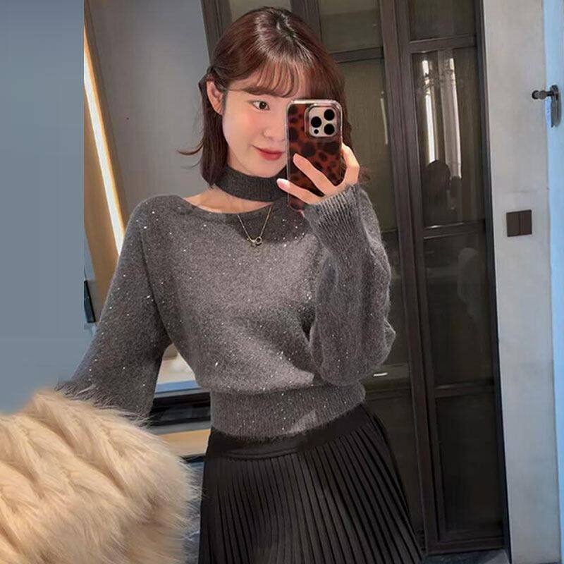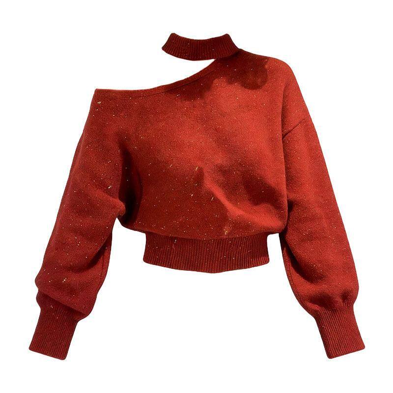 红色斜肩挂脖亮丝毛衣女款2026新款冬季跨年氛围感巨好看百搭上衣
