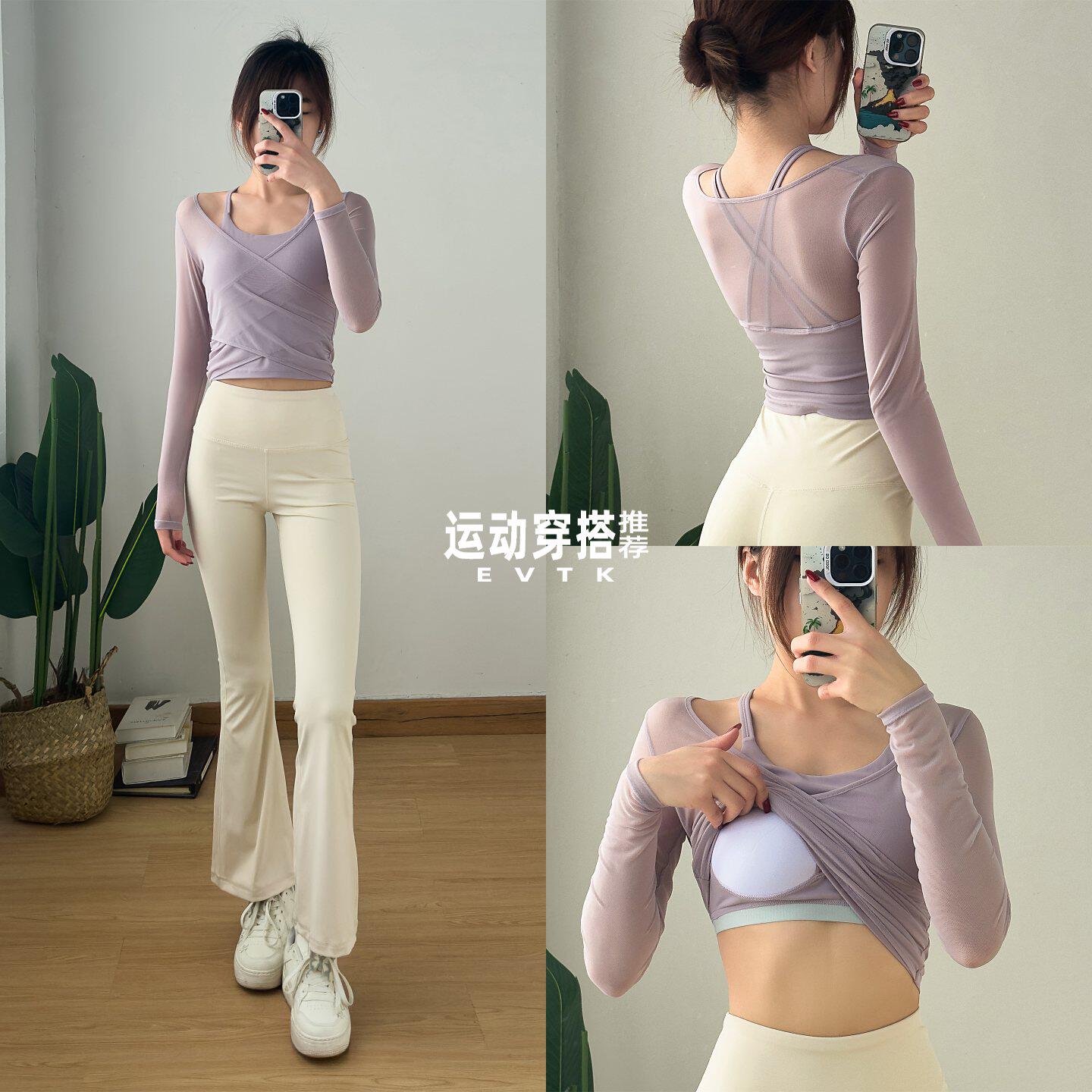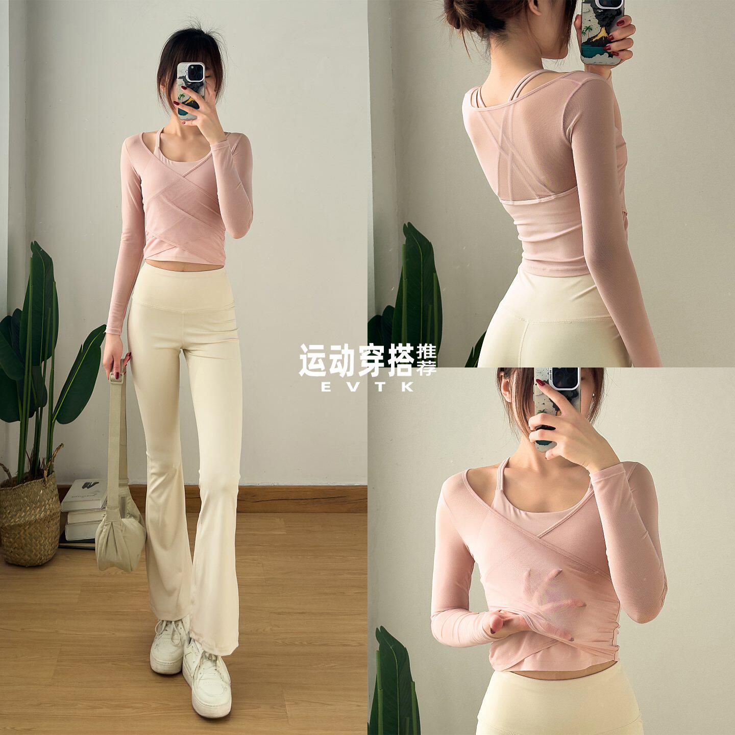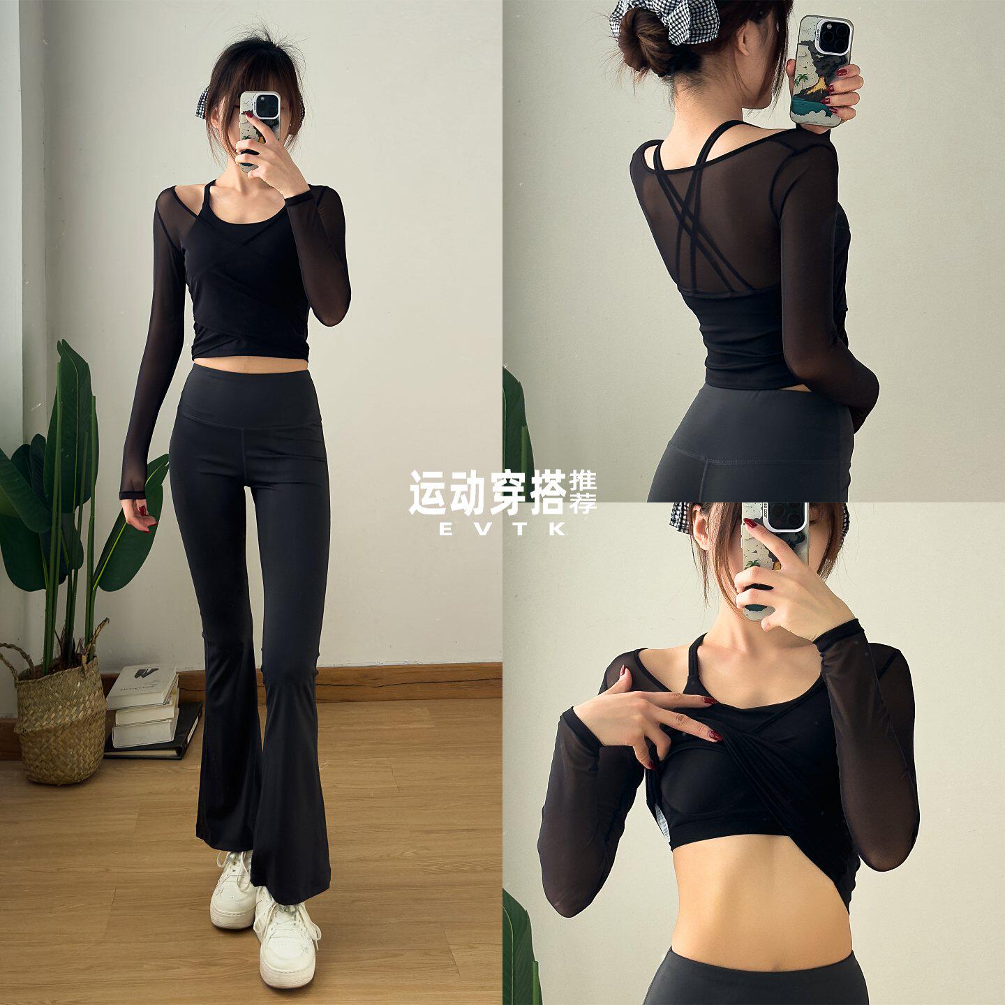 瑜伽套装运动t恤速干长袖网球服春秋跑步健身带胸垫上衣微喇长裤