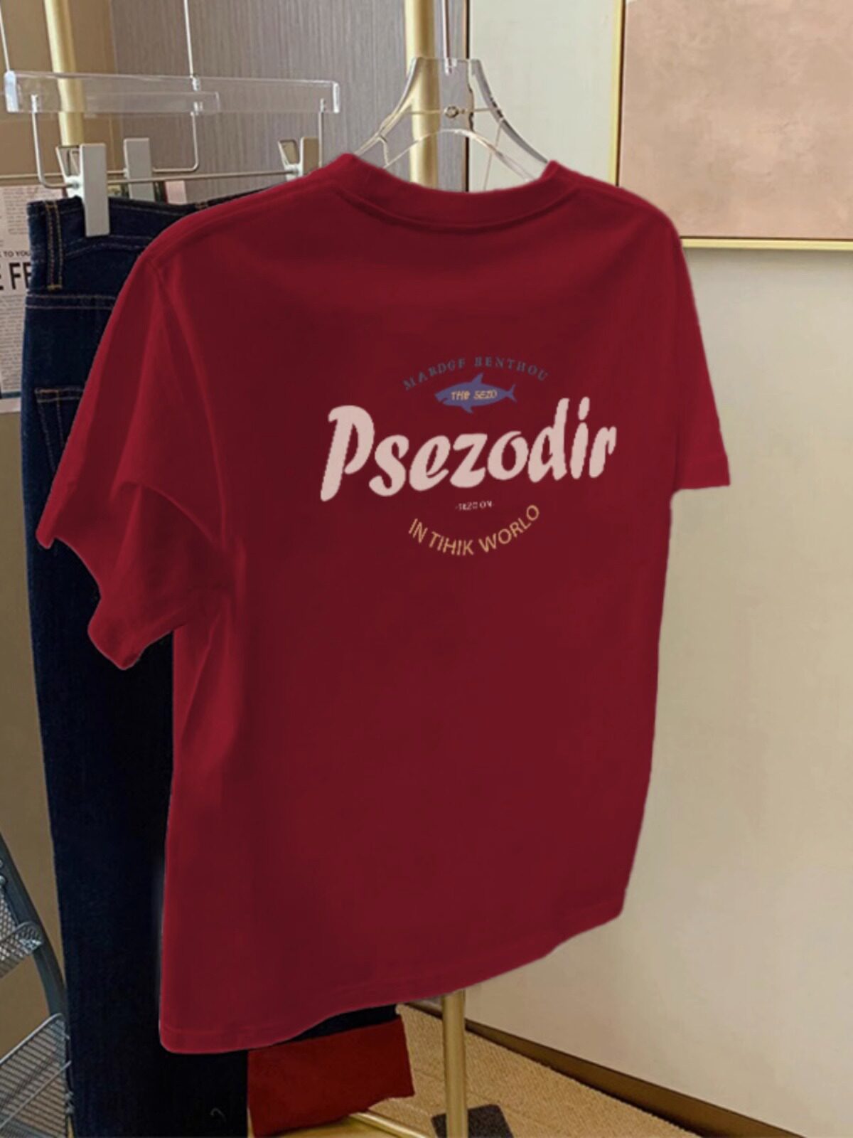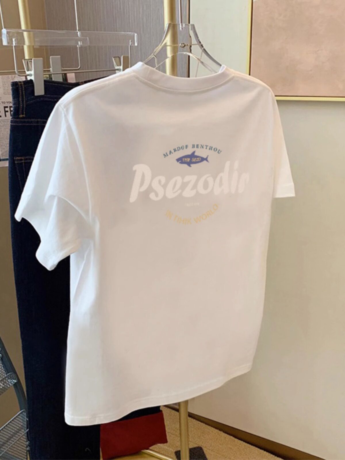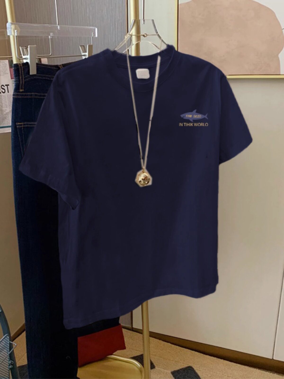 藏蓝色正肩短袖t恤女夏季2026新款宽松大码半袖美式复古纯棉上衣