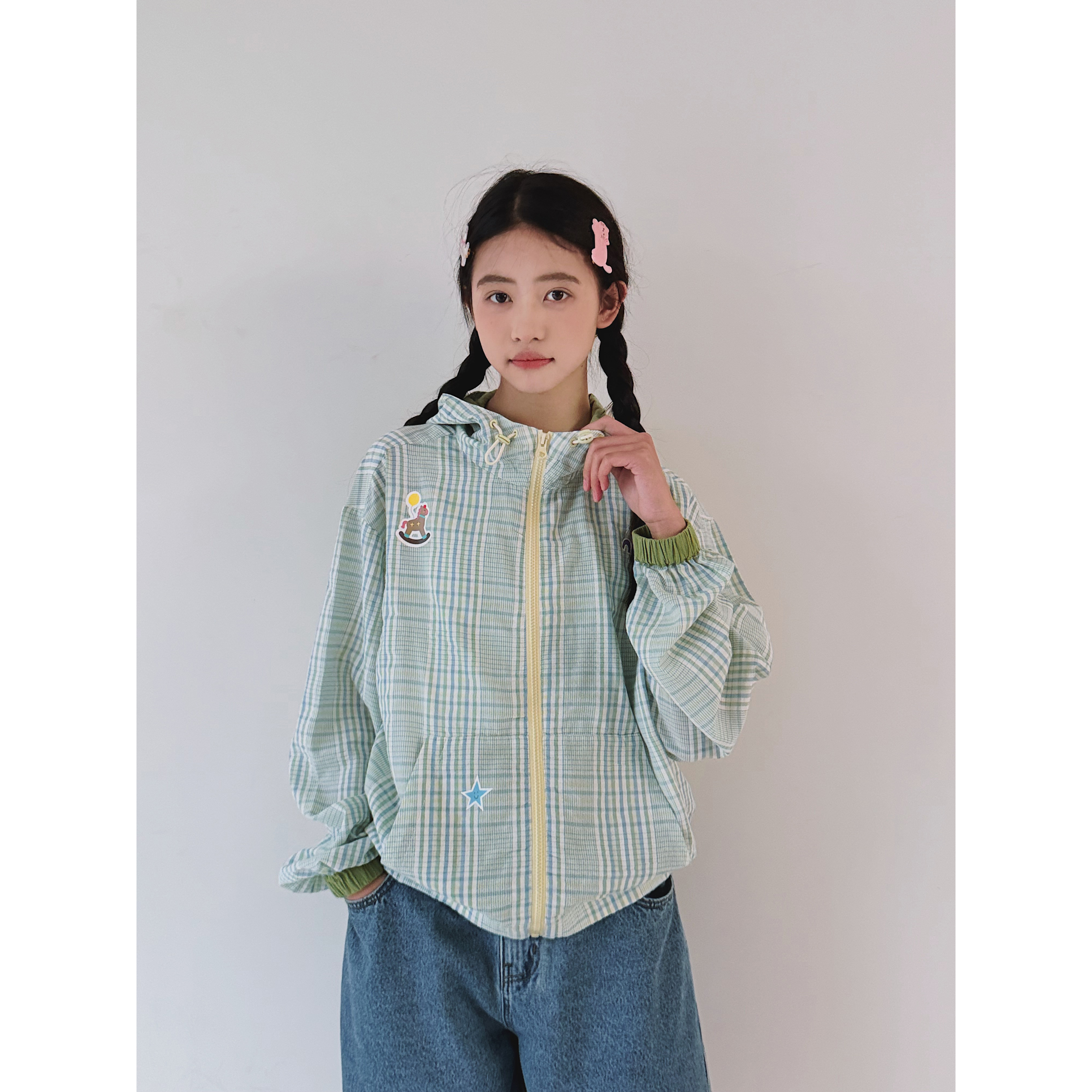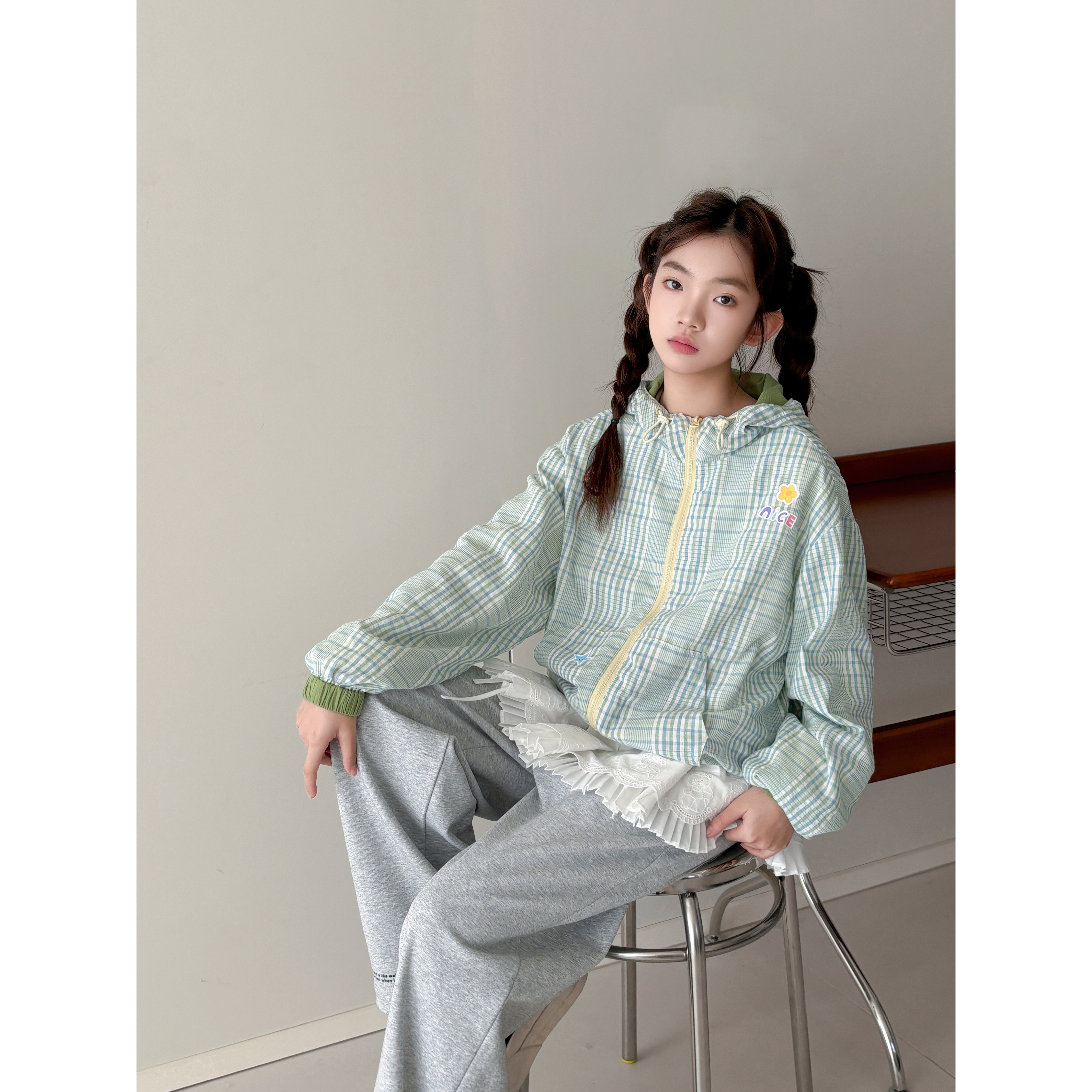 【放假了】初中生女孩外套2026春装新款青少年格纹薄款连帽拉链衫
