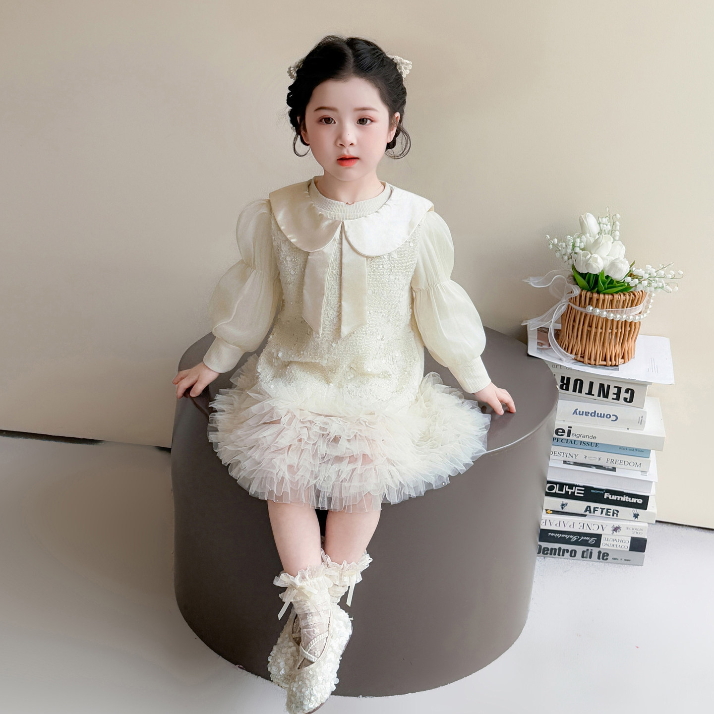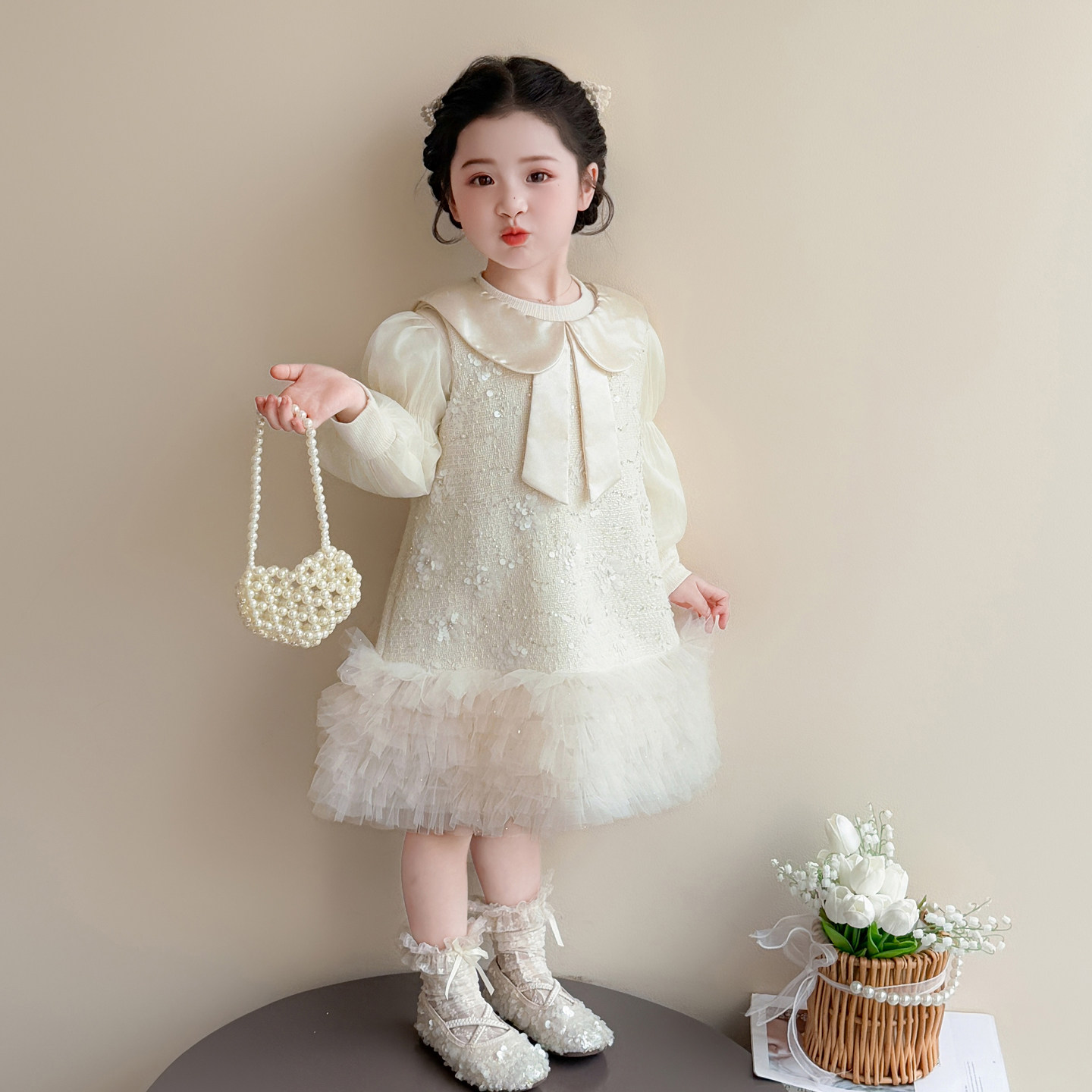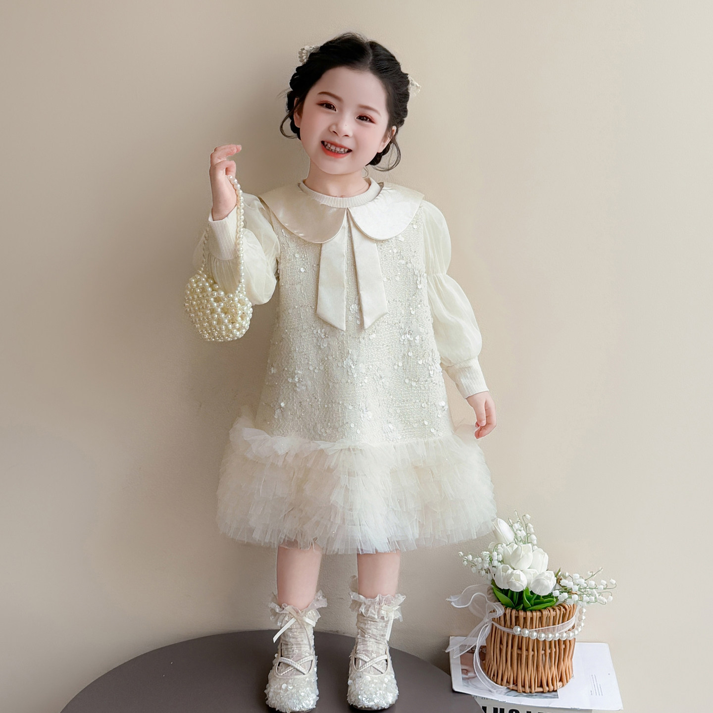 女童连衣裙春季2026新款小香风白色网纱裙蝴蝶结娃娃领生日礼服裙