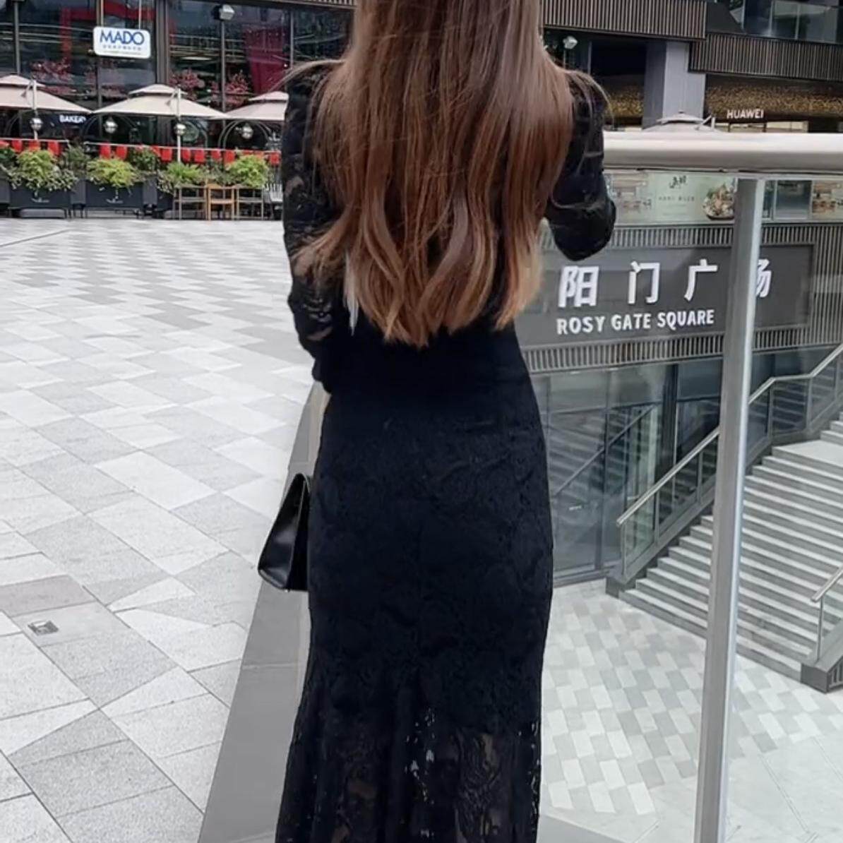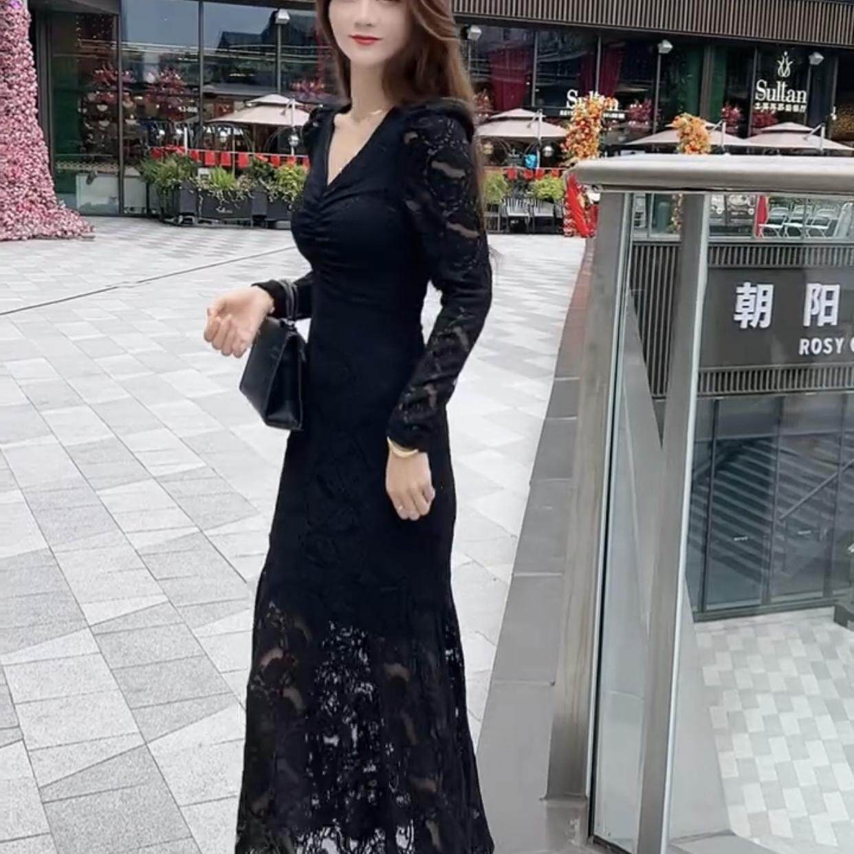 2024高级感气质长袖蕾丝连衣裙女秋冬轻奢风V领修身高腰显瘦长裙