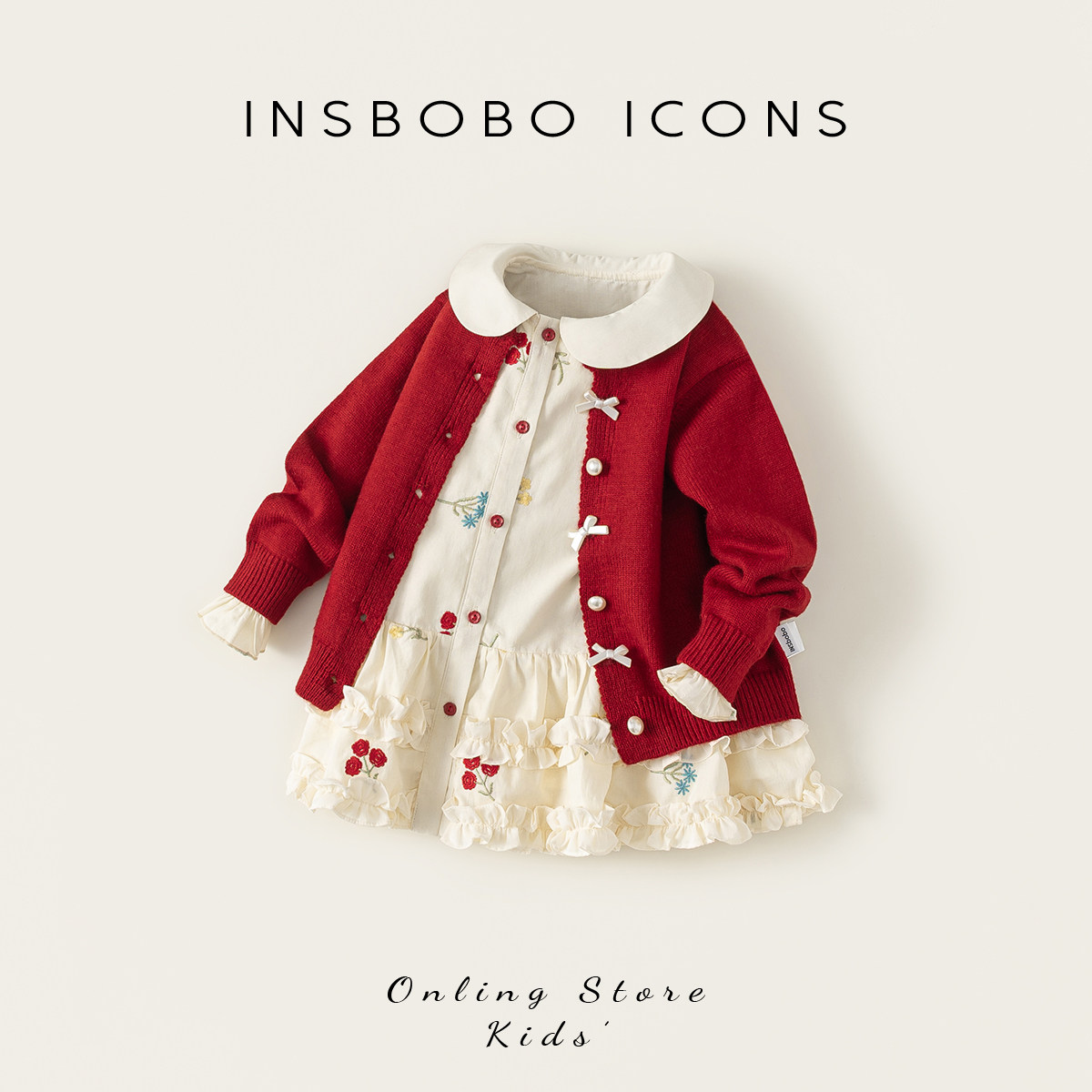 INSbobo女童裙子2026春季新款儿童连衣裙女孩红色公主裙套装裙潮