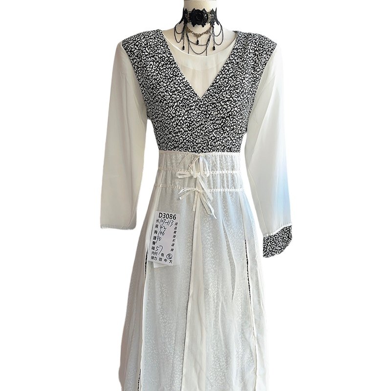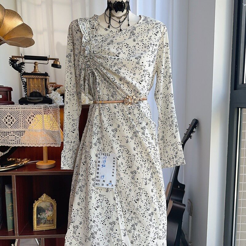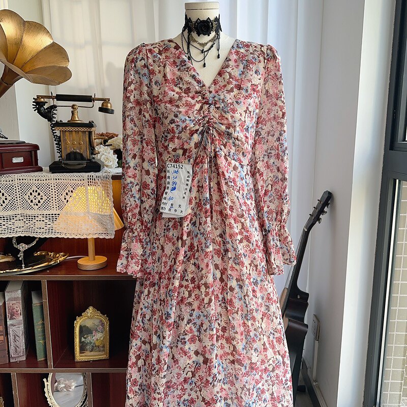 古着复古vintage港风文艺80年代老港货长款碎花长袖雪纺连衣裙56