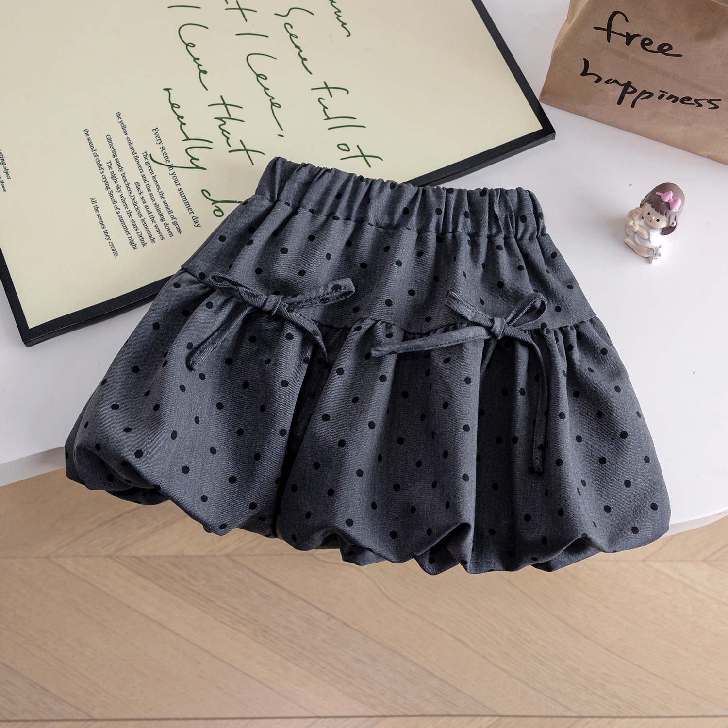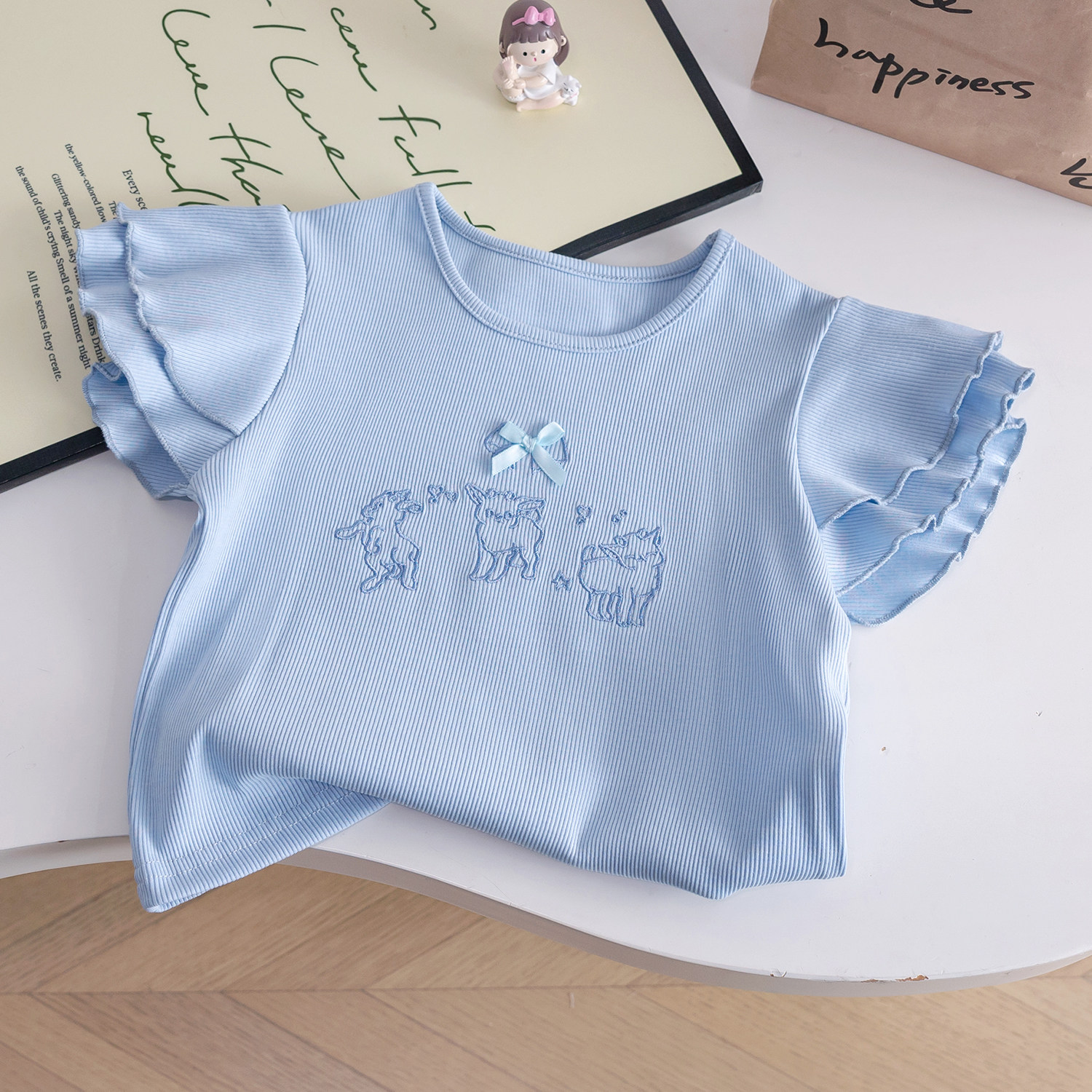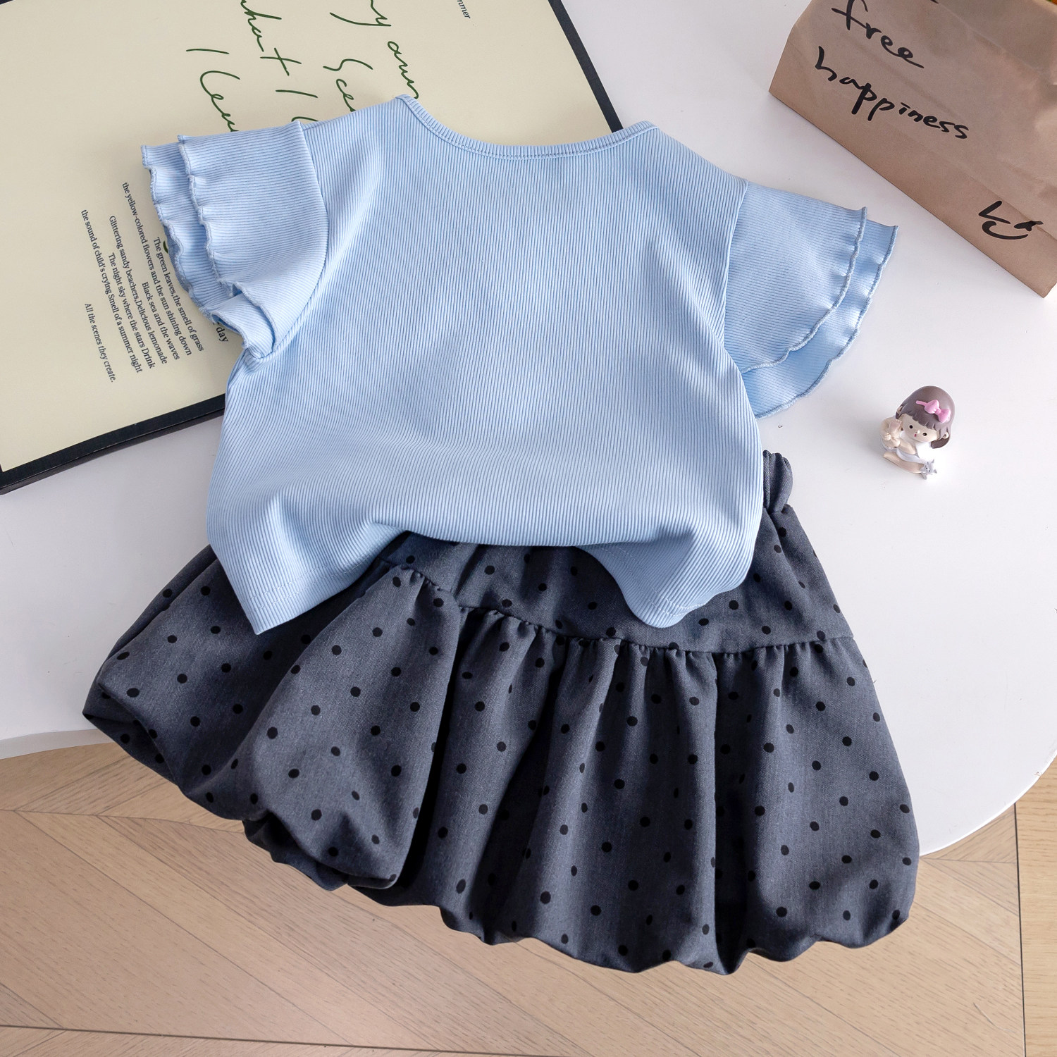 2025女童套装蓝色木耳边上衣短袖t+波点花苞短裙夏装新款两件套