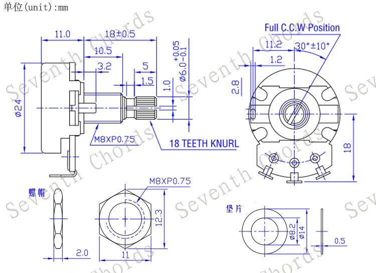 18MM金色铜轴电吉他贝司大电位器音量音色电子开关旋钮500K 250K
