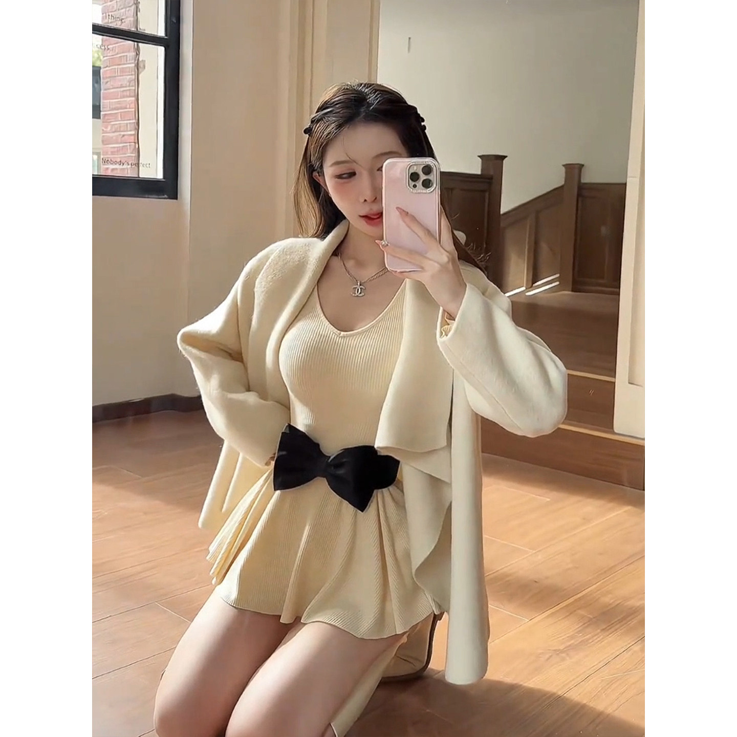 XZY 微胖名媛千金风蝴蝶结针织连衣裙女25年冬季内搭修身收腰短裙