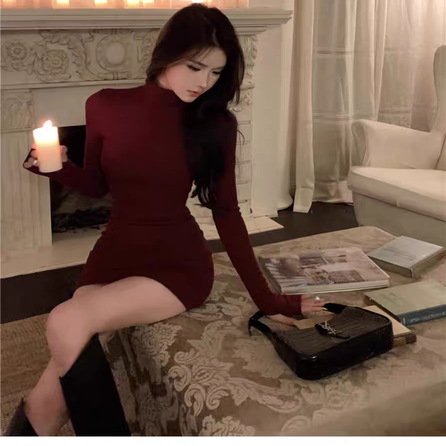 酒红色大码高领秋冬连衣裙女新款修身显瘦配大衣包臀裙内搭打底裙