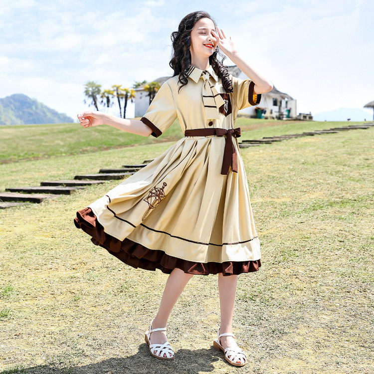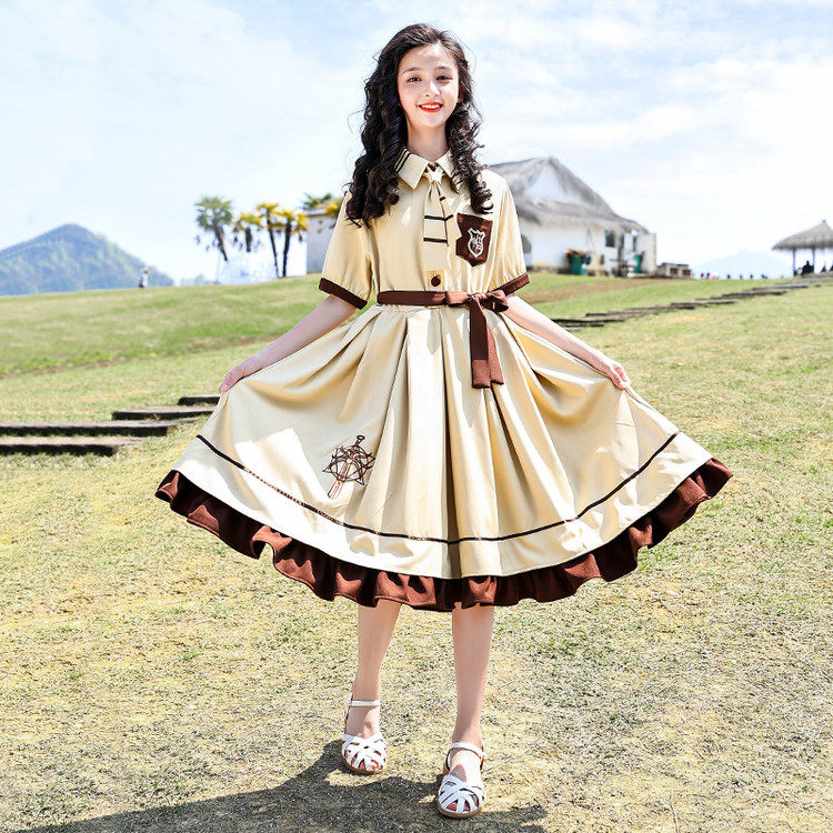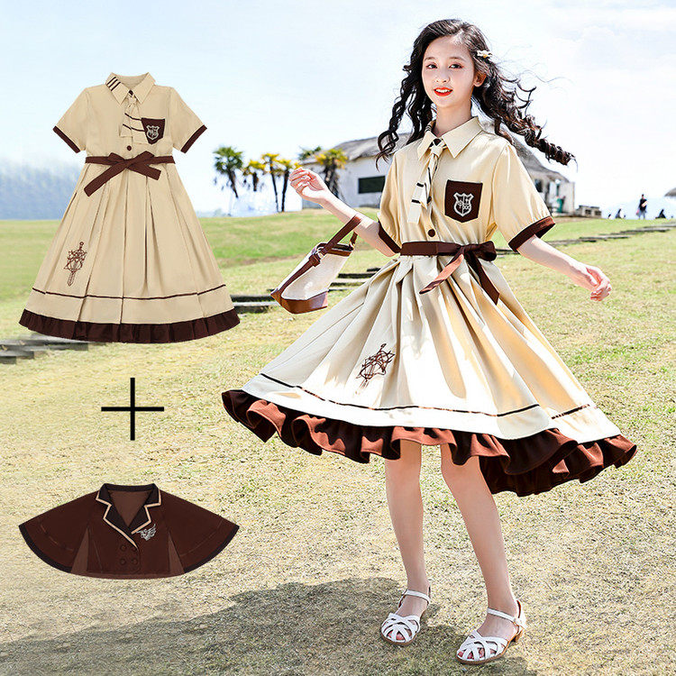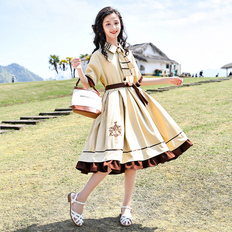 2026长袖薄款学院风洛丽塔连衣裙女童夏季卡其色收腰中长裙公主裙