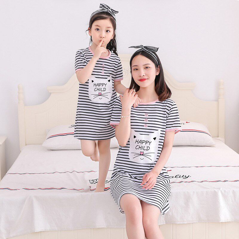 夏季7女童9睡裙10纯棉6短袖薄款儿童睡衣女孩母女连衣裙家居服8岁