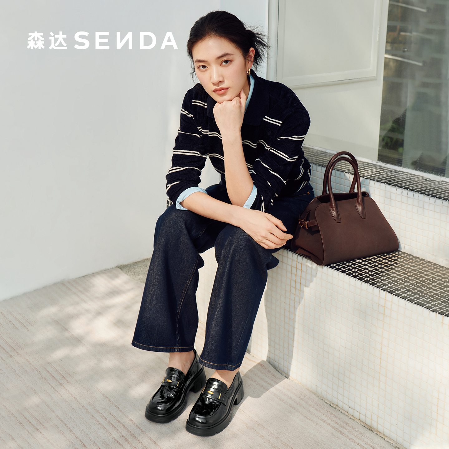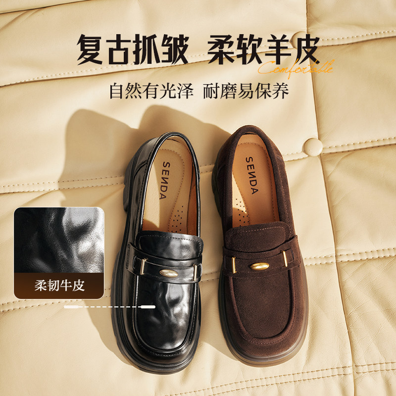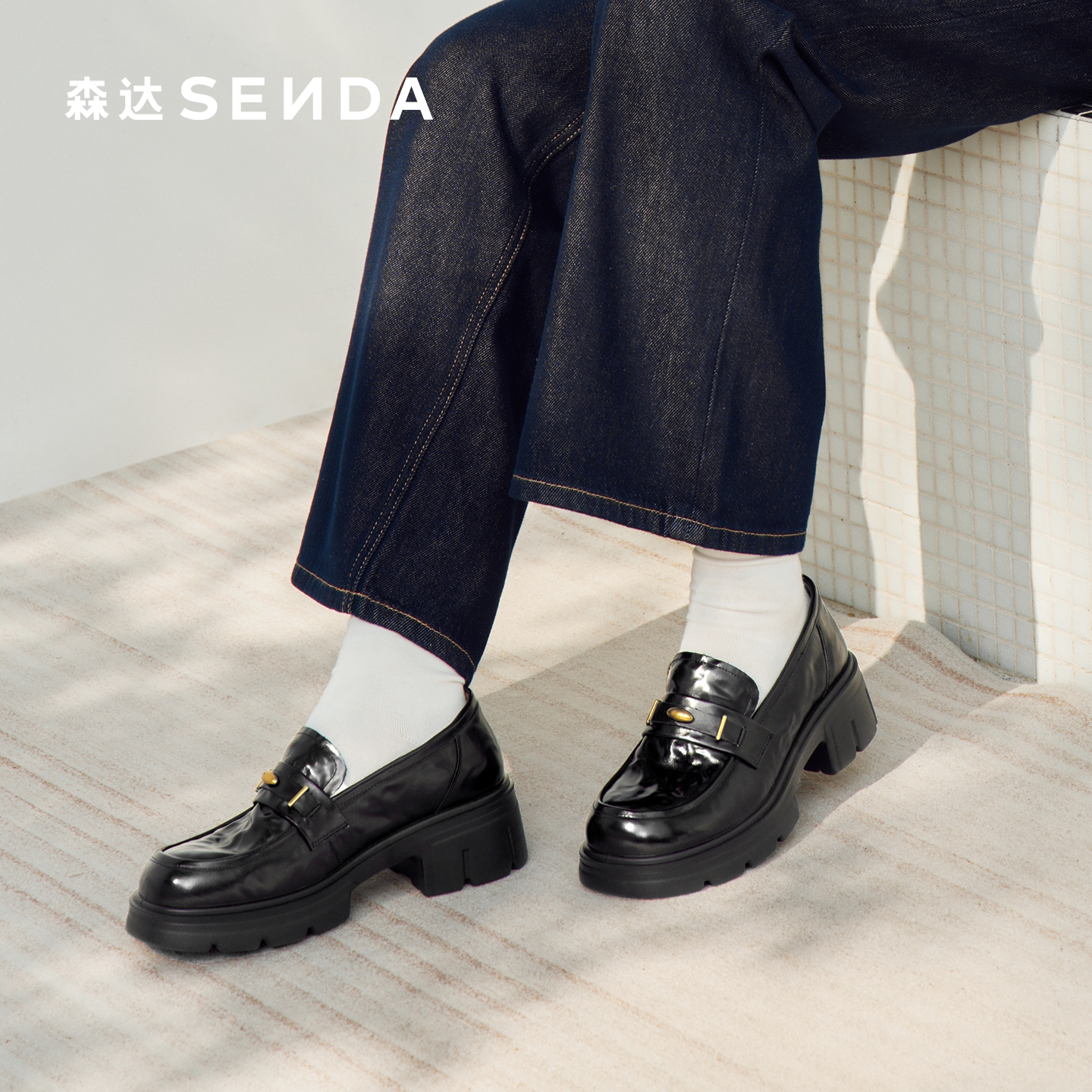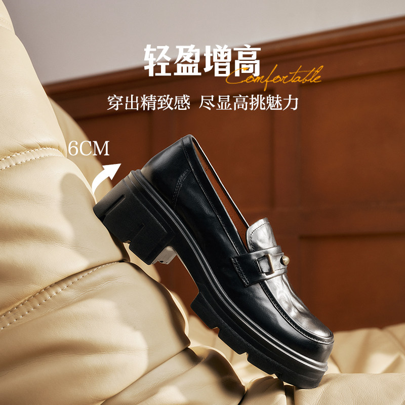森达厚底乐福鞋女鞋26春新款皮鞋增高软底真皮牛皮黑色中跟皮鞋女