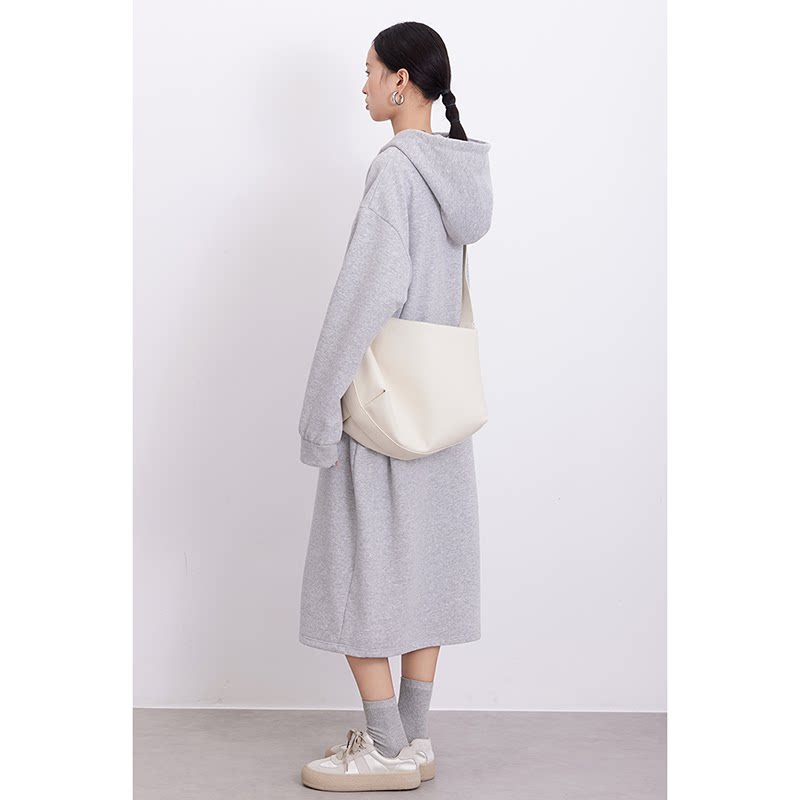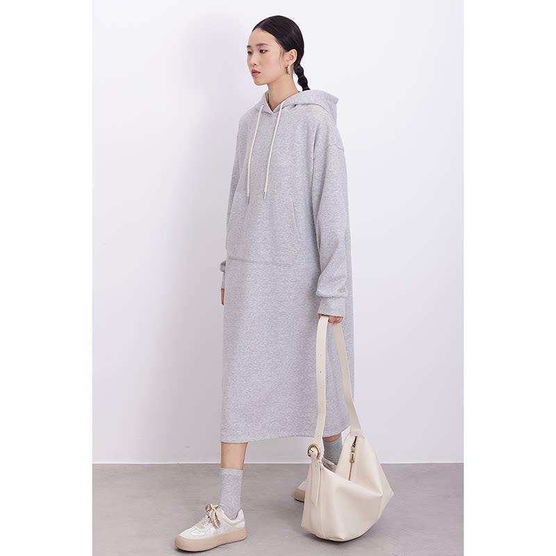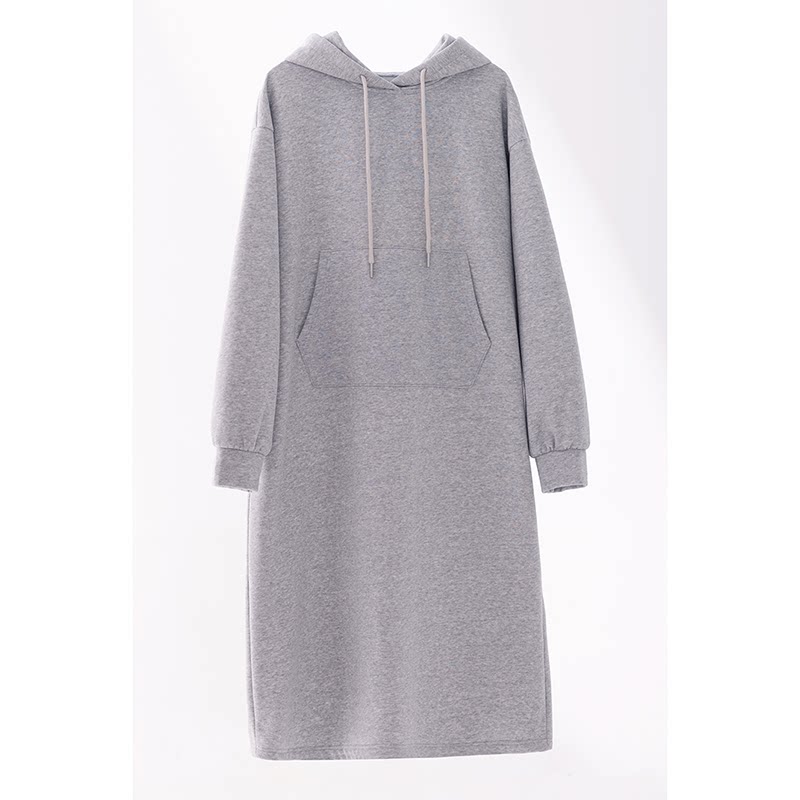连帽加绒卫衣连衣裙女士长袖秋冬运动休闲过膝长款打底外穿灰色