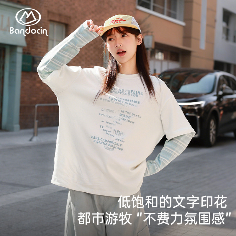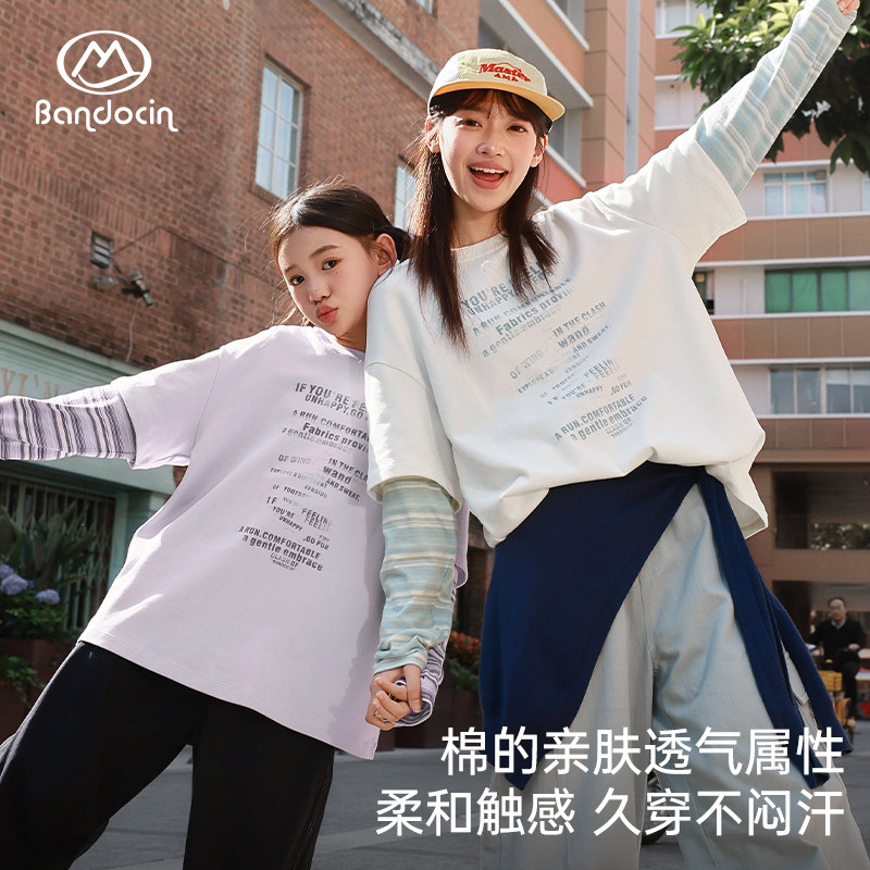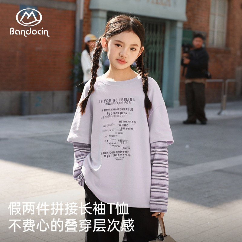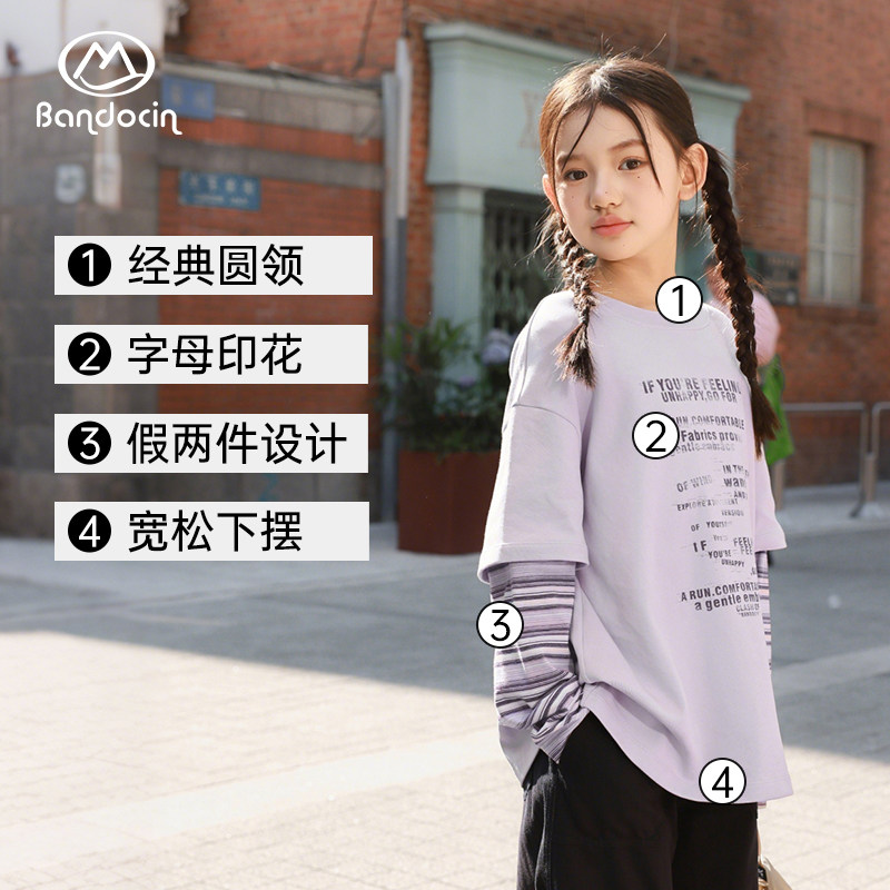 【春装上新】半度闲女童春装假两件印花t恤运动上衣潮