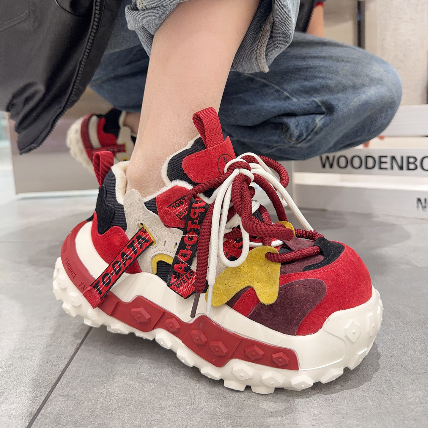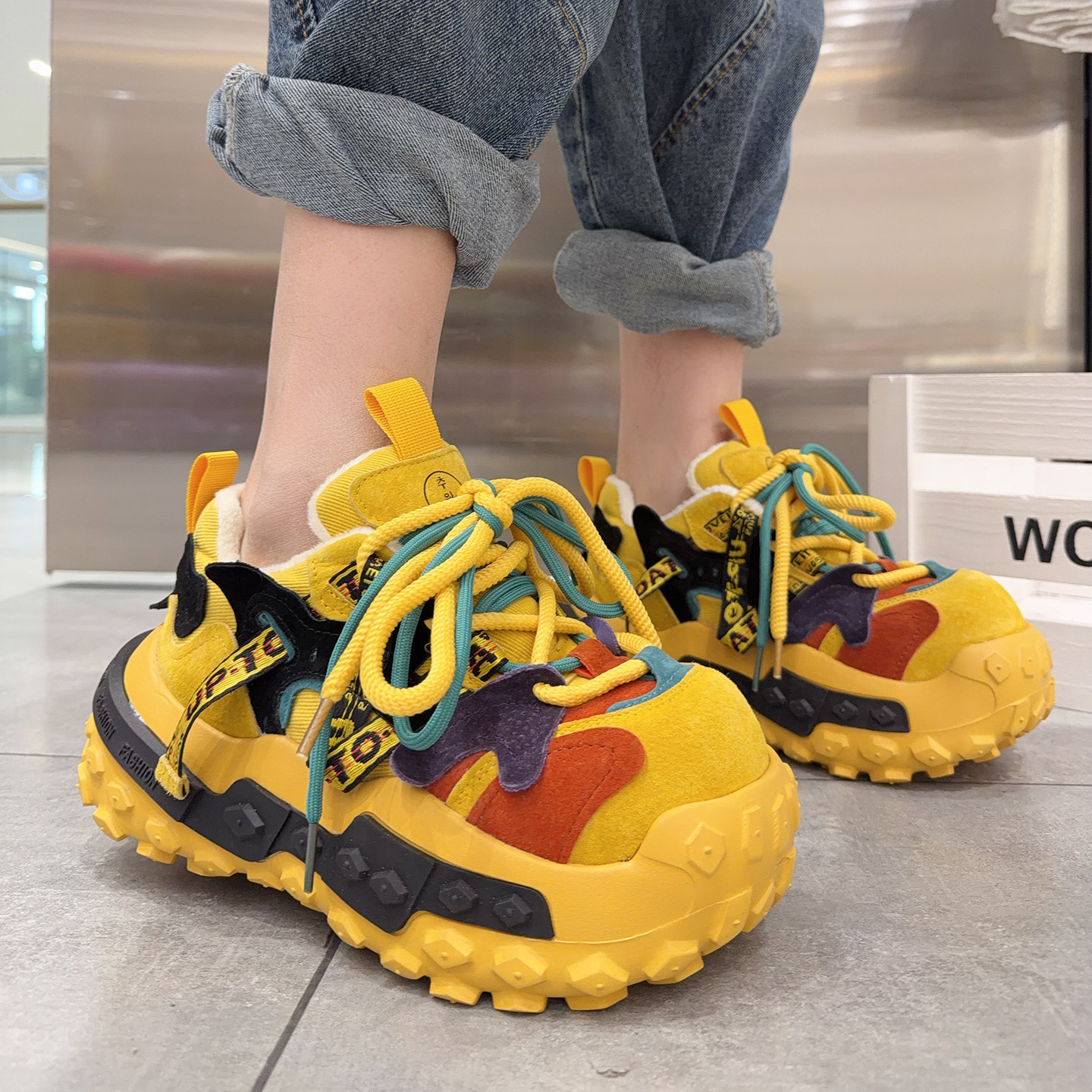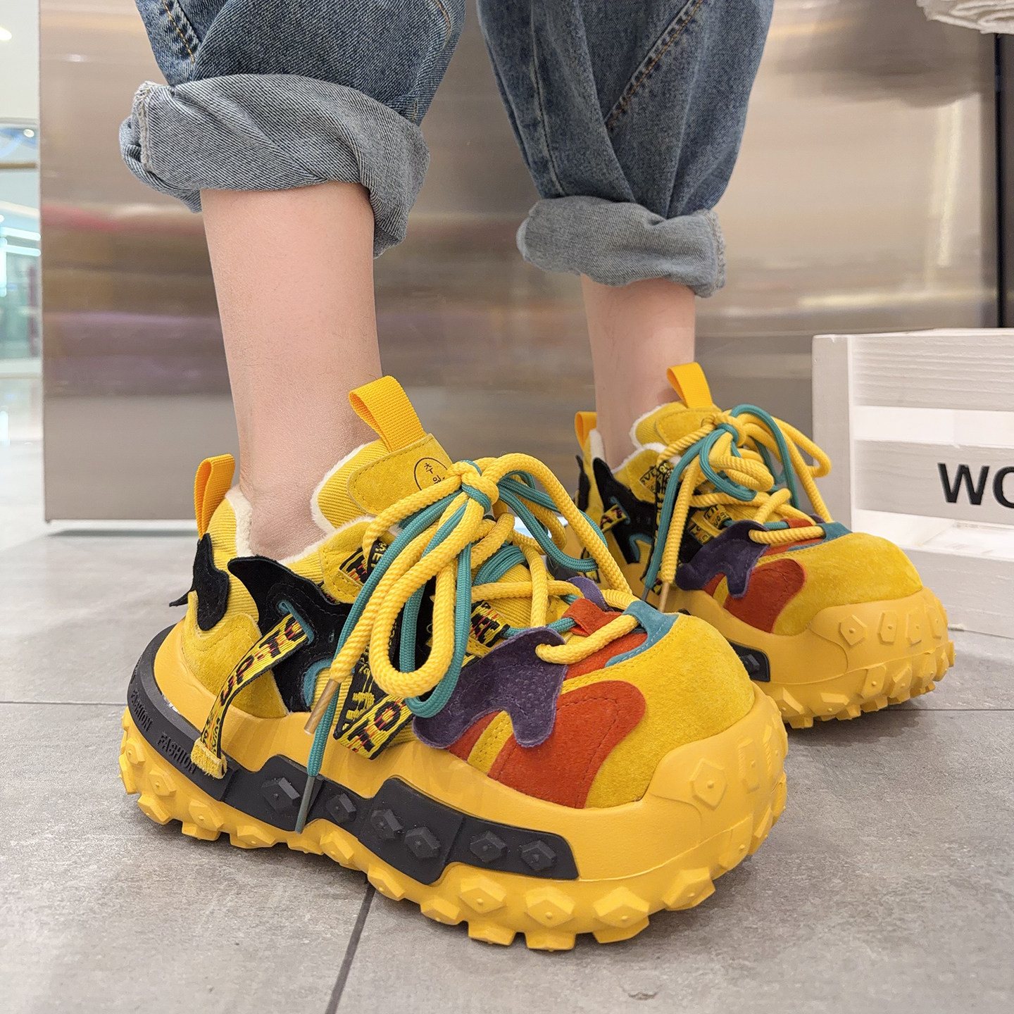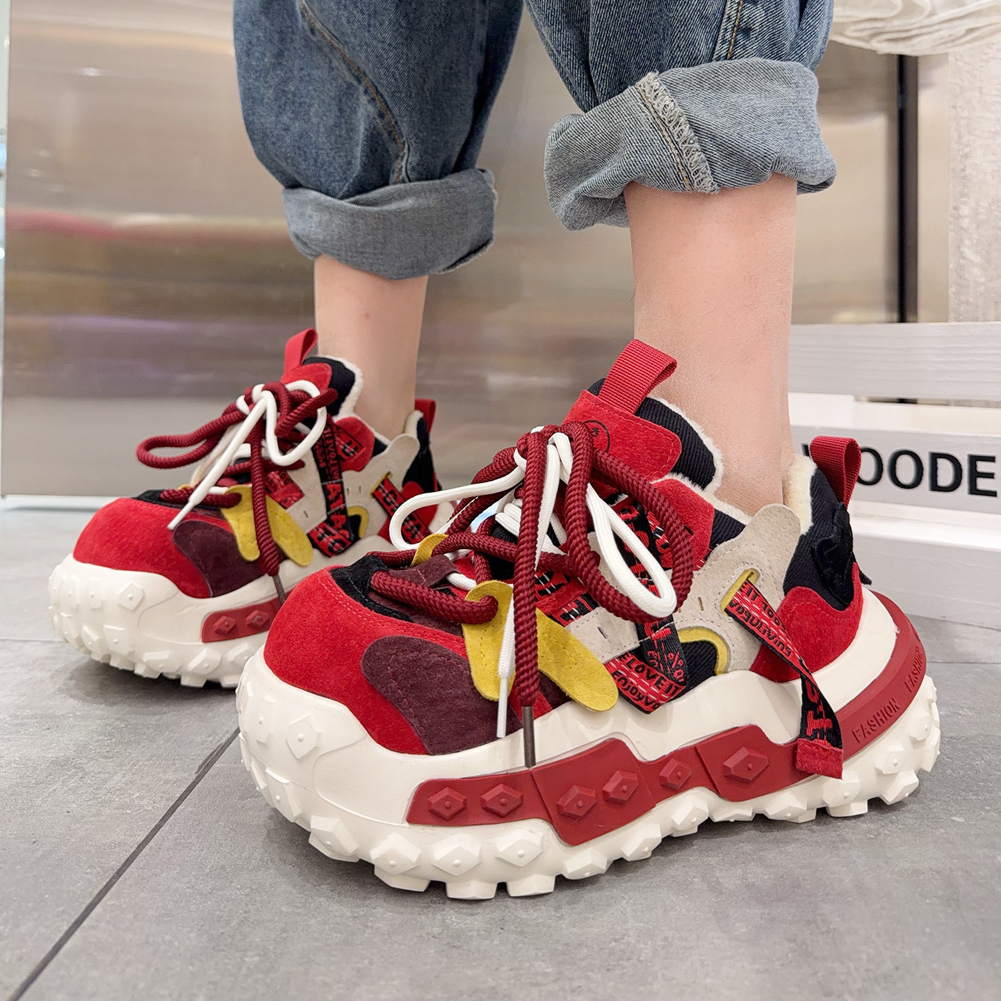 欧洲站系带真皮运动休闲鞋女2025年冬季新款加绒老爹鞋女厚底棉鞋