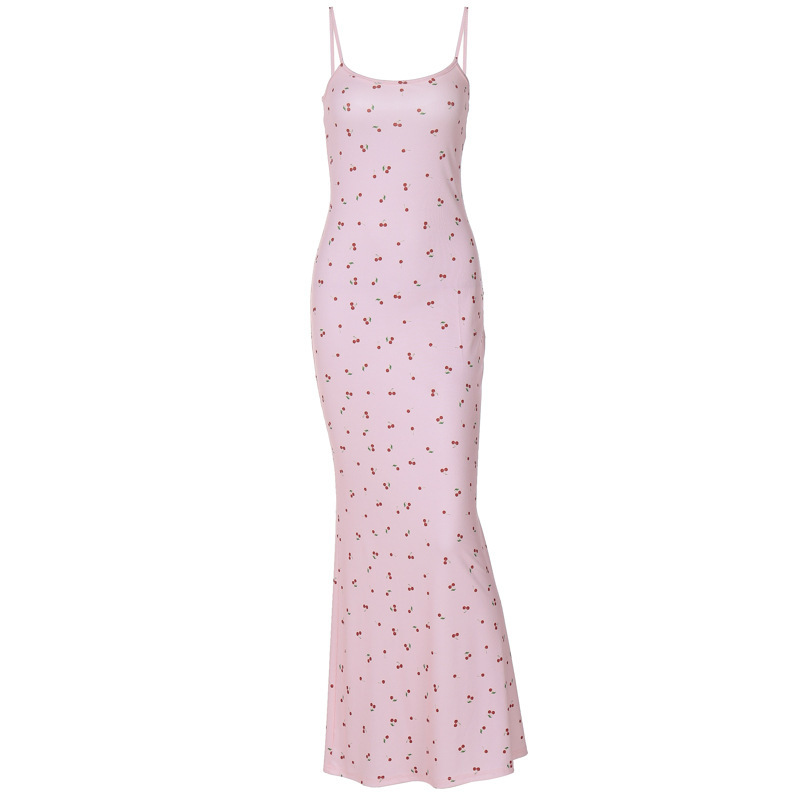 elsa欧美女装新款樱桃甜美风吊带裙修身包臀长款碎花辣妹连衣裙