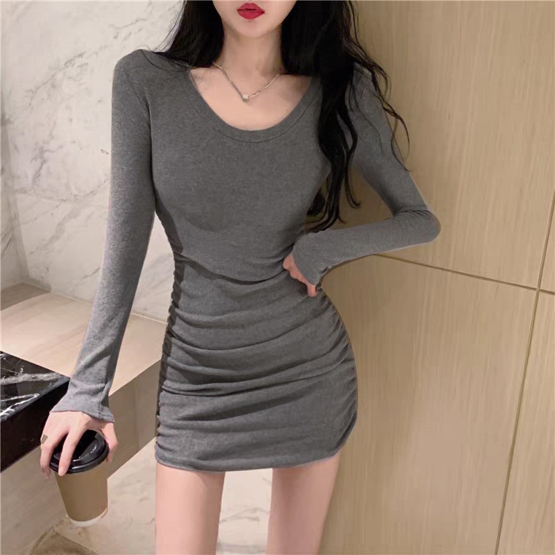 黑色性感纯欲风连衣裙女大码微胖褶皱显瘦长袖包臀裙秋冬加绒短裙
